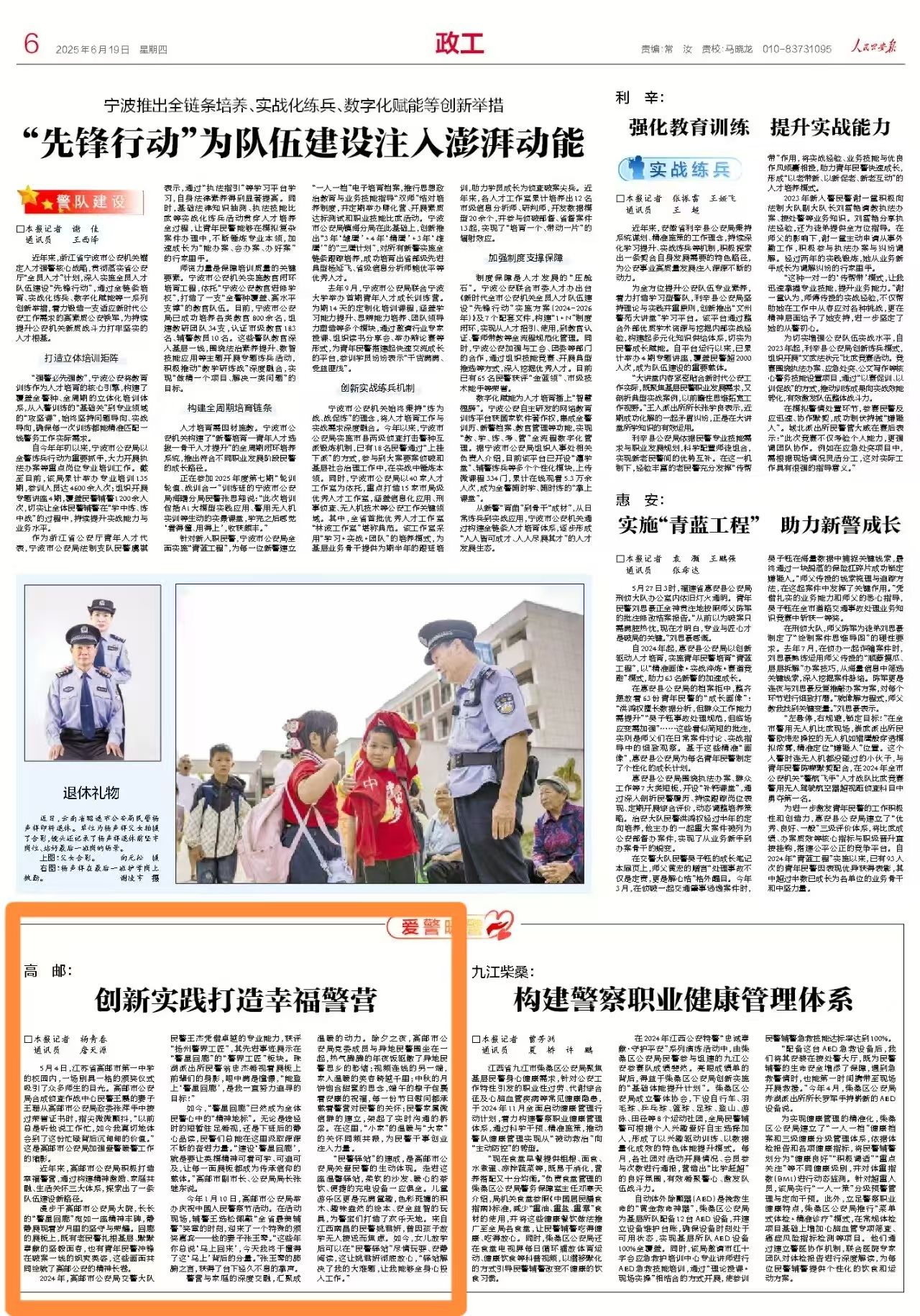 6月19日出版的《人民公安报》以《高邮:创新实践打造幸福警营》为题,报道了近年来,高邮市公安局积极打造幸福警营,通过构建精神激励、家庭共融、生活关怀三大体系,探索出了一条队伍建设新路径。