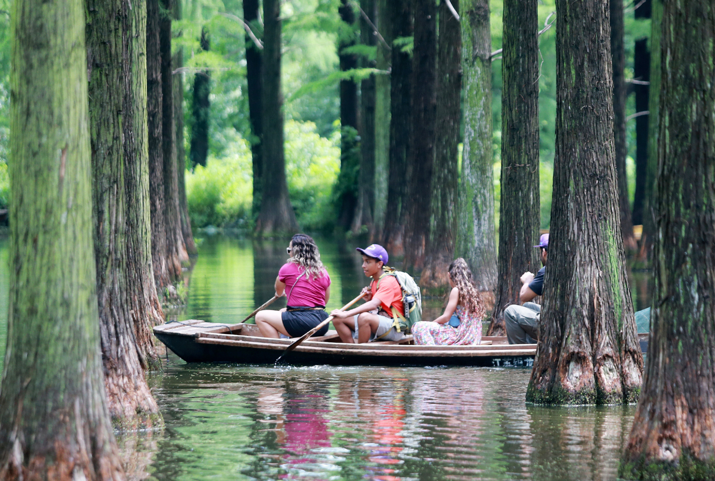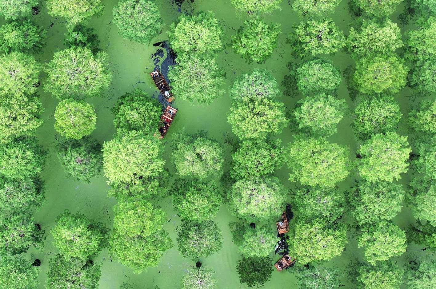 位于江都区邵伯镇的渌洋湖湿地公园内“水上森林”葱郁清凉,成为游客休闲避暑的好去处。大家穿梭在水杉林中游览,享受开心畅快的“清凉一夏”。 孟德龙 摄