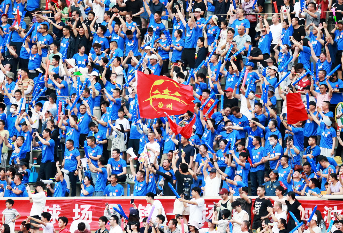 “苏超”第4轮扬州主场比赛现场,球迷加油助威。资料图片