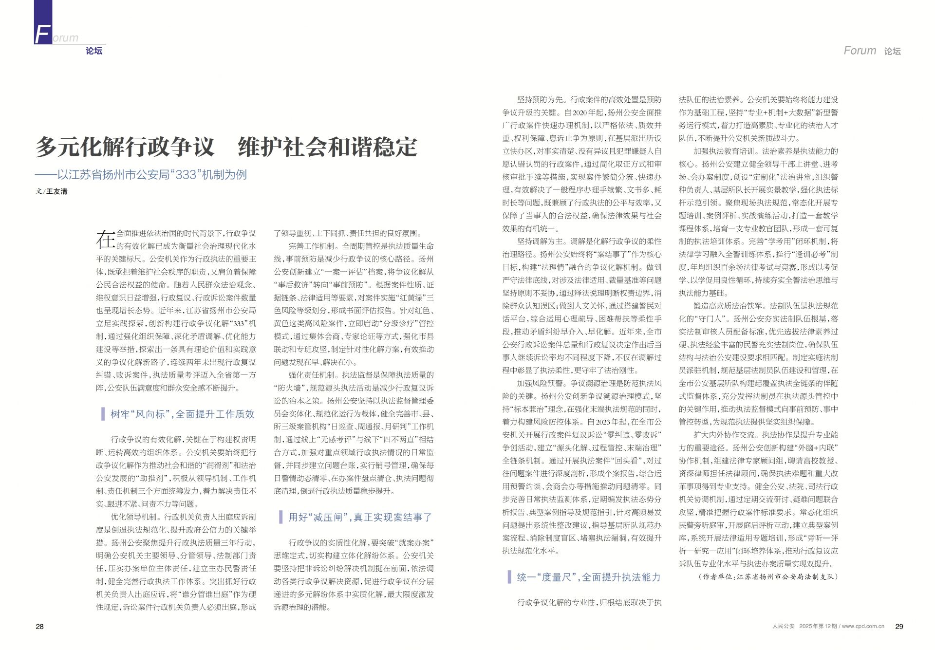 编者按:6月25日出版的《人民公安》杂志以《多元化解行政争议 维护社会和谐稳定》为题,关注扬州市公安局“333”机制。