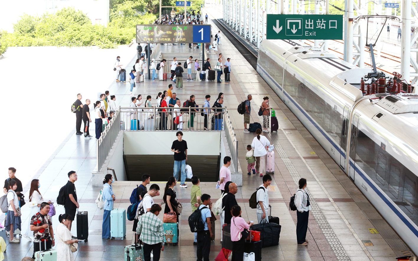 7月1日,为期62天的2025年全国铁路暑期运输启动。7月1日至8月31日,全国铁路预计发送旅客9.53亿人次,同比增长5.8%,日均发送旅客1537万人次。图为旅客在高铁扬州东站等候乘车。