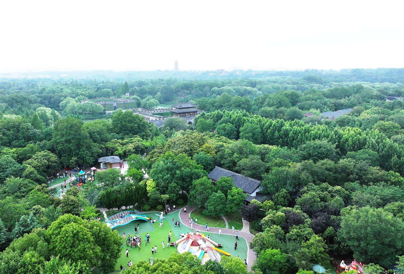 盛夏时节,宋夹城体育休闲公园花繁叶茂、绿意葱茏,不少市民、游客来此享受绿色,避暑游玩。