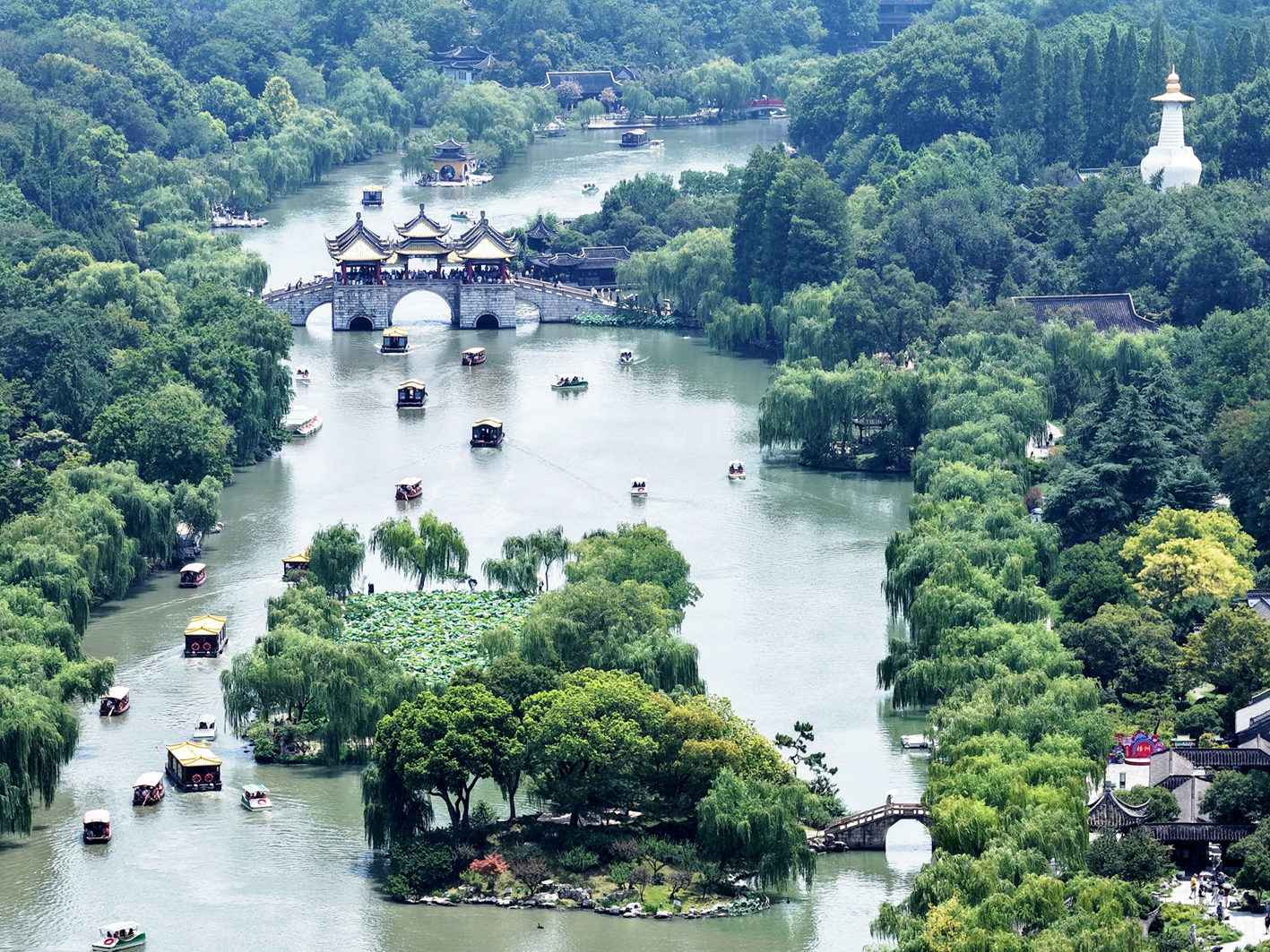 眼下,多地持续高温,酷暑热浪催热“清凉经济”。图为7月13日,游客乘坐游船在瘦西湖风景区游览。 新华社发(孟德龙 摄)