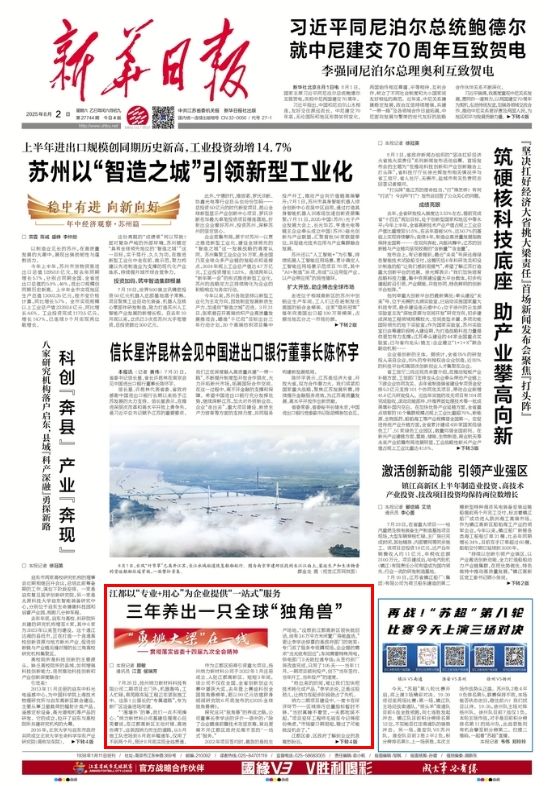 8月2日,《新华日报》头版刊发题为《三年养出一只全球“独角兽”》的文章。现全文转发,以飨读者。
