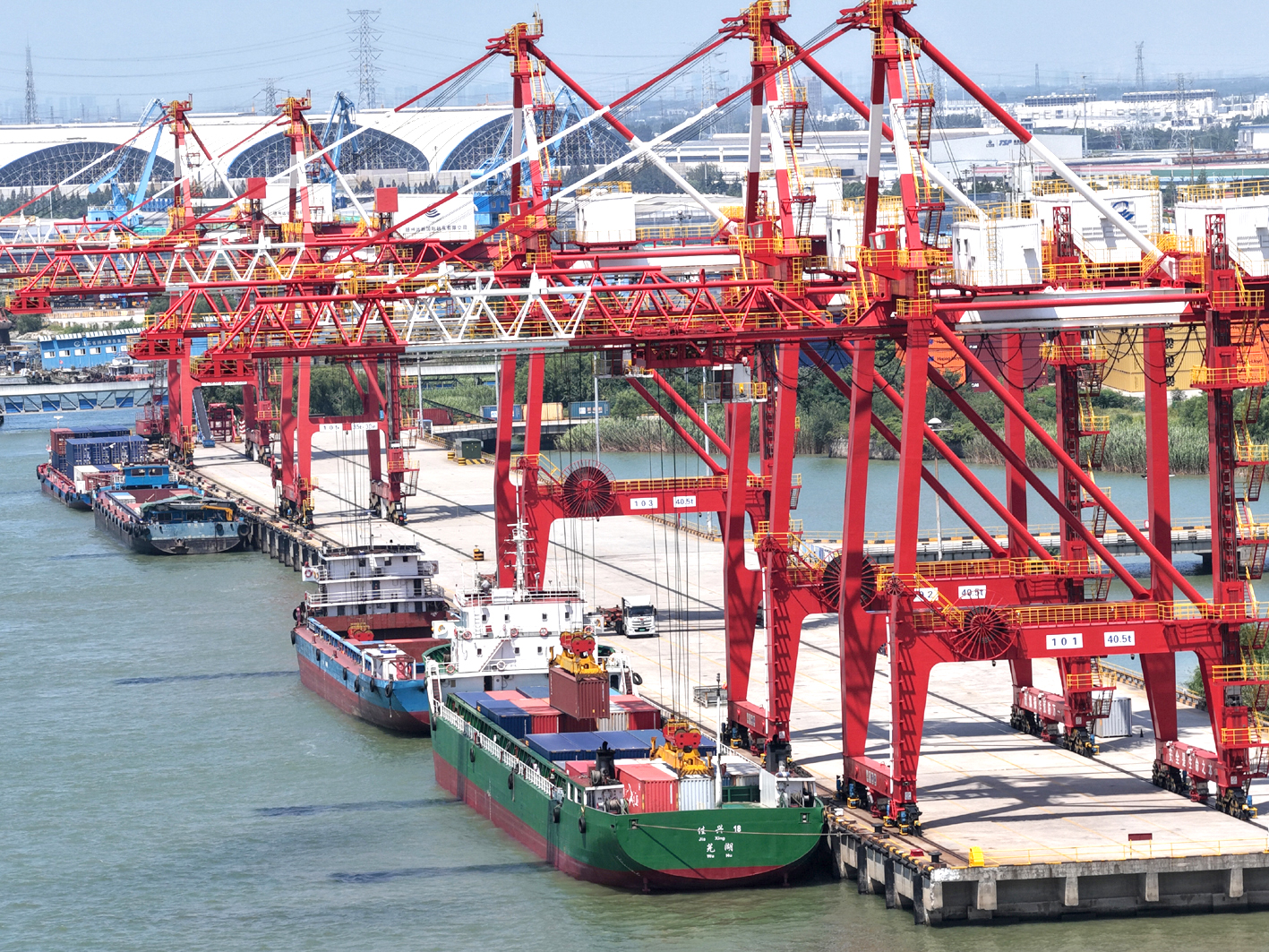 港口是重要基础性、枢纽性设施,是推动经济社会发展的重要引擎。近年来,扬州港“一港三区”发展格局加快完善,“河江海”联运功能持续增强,风电等临港产业加快发展,港口能级不断提高。图为货轮在扬州港泊位上有序装卸,一派繁忙景象。