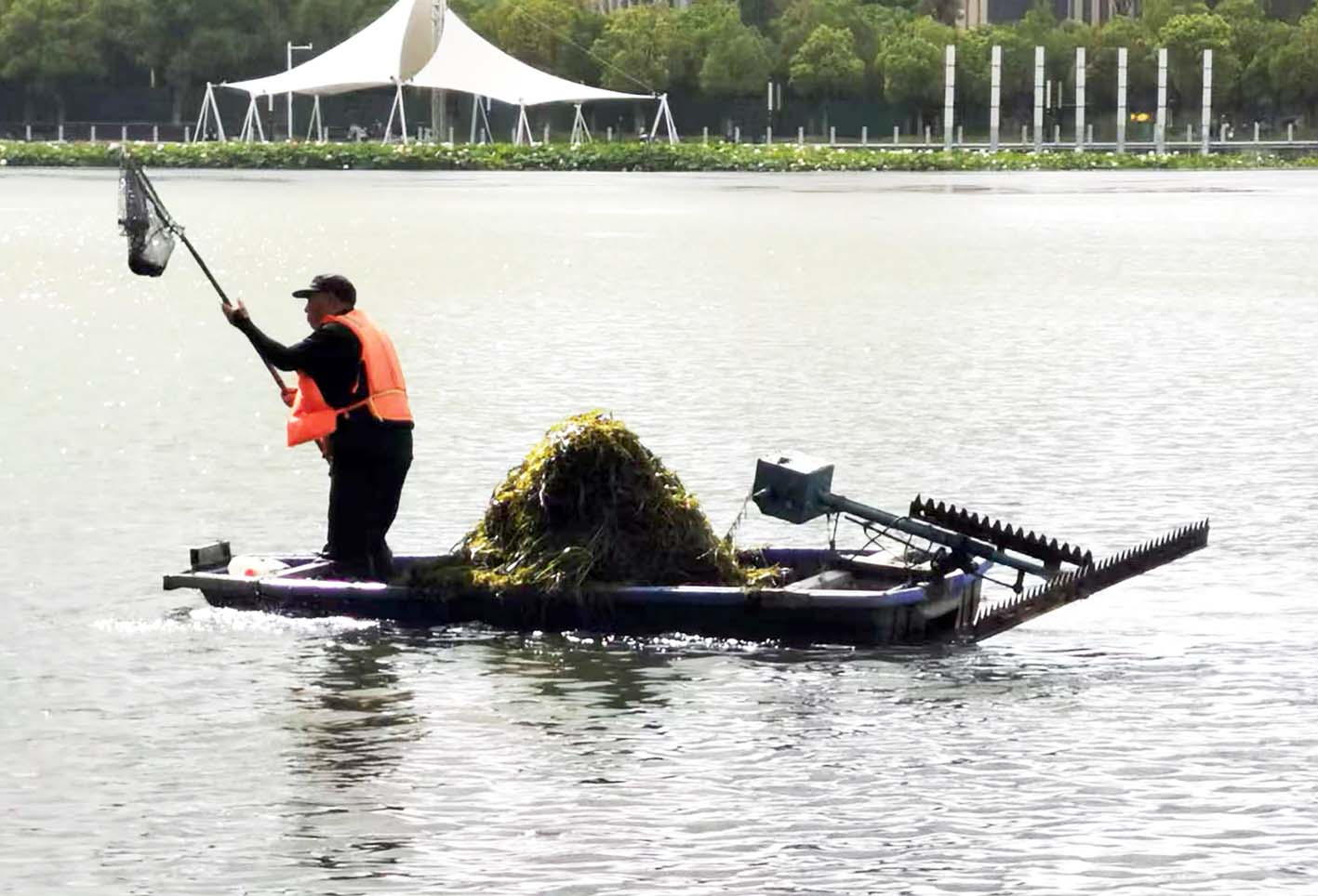 连日来,担负明月湖公园湖面保洁工作的“水上美容师”变得格外忙碌起来。他们早出晚归,对湖中的水草及漂浮物进行打捞,用辛勤的汗水换来“水天一色”的夏日生态画卷。