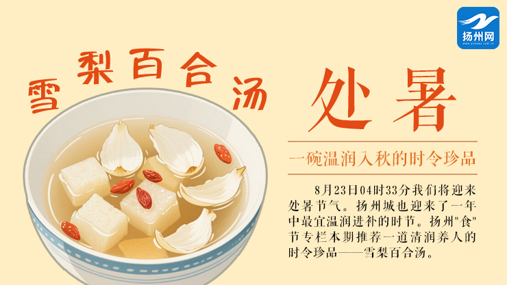 北京时间2025年8月23日04时33分我们将迎来处暑节气。扬州城也迎来了一年中最宜温润进补的时节。扬州"食"节专栏本期推荐一道清润养人的时令珍品——雪梨百合汤。这道汤品取新鲜百合,瓣瓣如玉,清甜软糯,配以酥梨切块文火慢炖,佐以冰糖、枸杞,汤色澄澈如琥珀,梨肉透亮似凝脂。