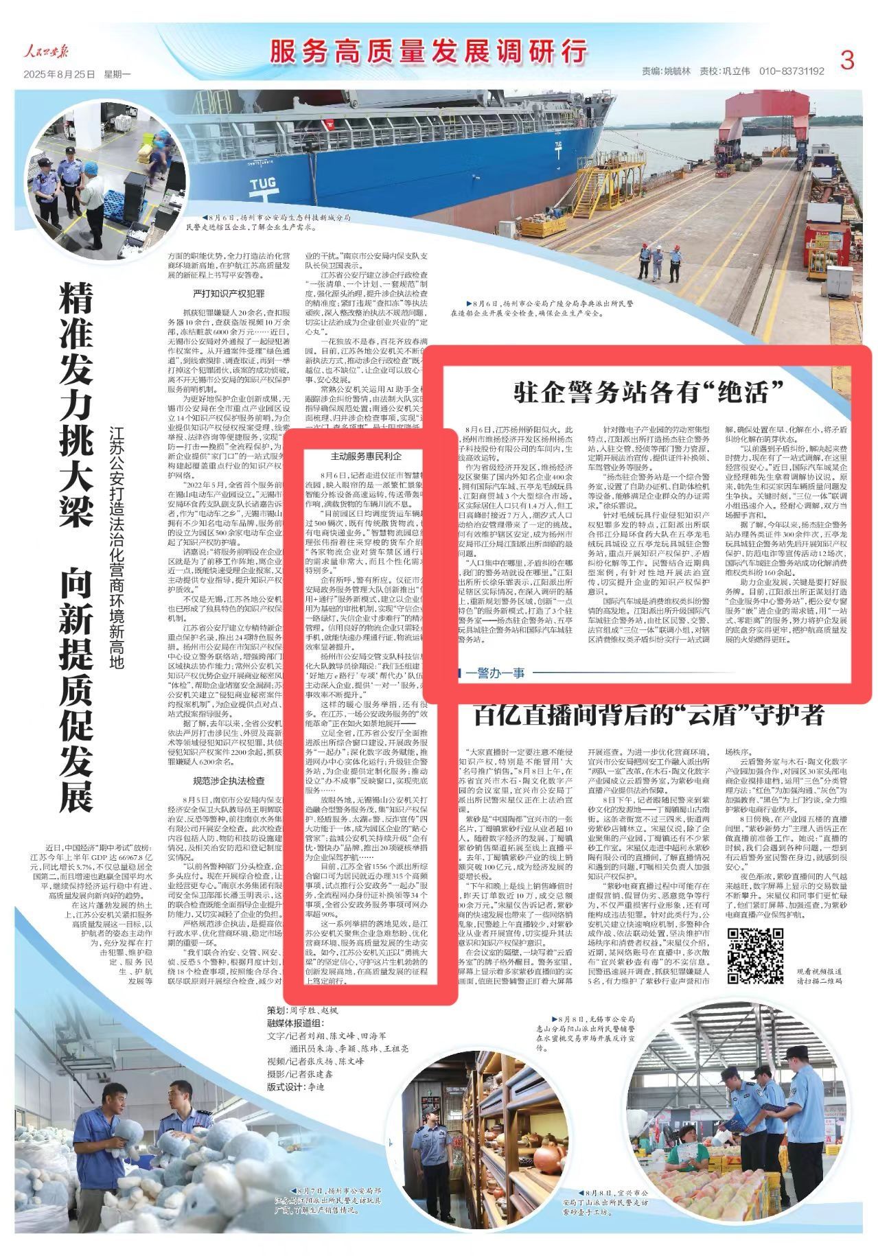 8月25日出版的《人民公安报》以《驻企警务站各有“绝活”》为题,报道了江阳派出所针对微电子产业园的劳动密集型特点打造扬杰驻企警务站,入驻交管、经侦等部门警力资源,定期开展法治宣传,提供证件补换领、车驾管业务等服务。