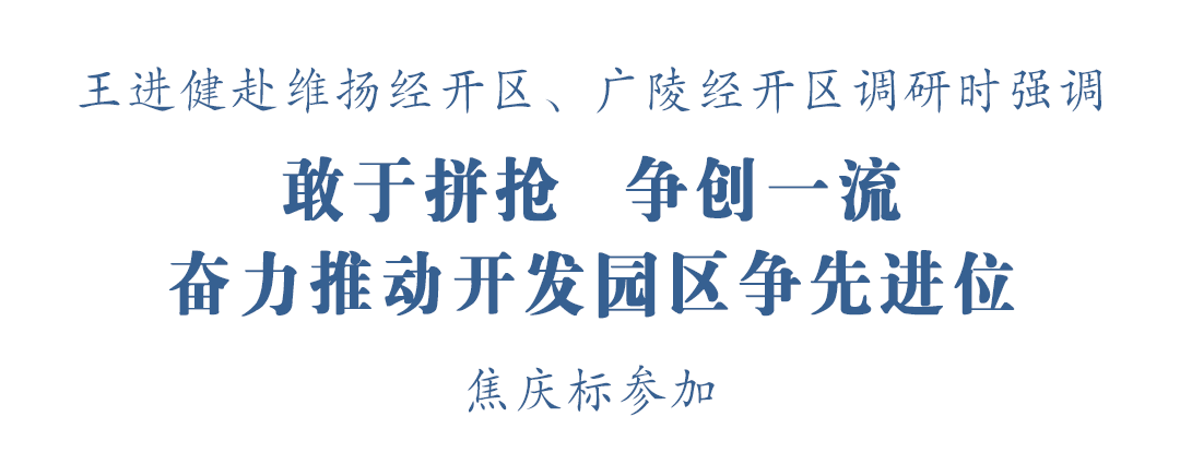 扬州网讯 (记者 伊然 仁辂) 8月27日,市委书记王进健赴维扬经开区、广陵经开区调研。他强调,要深入贯彻习近平总书记对江苏工作重要讲话精神,认真落实国家和省关于开发园区的部署要求,敢于拼抢、争创一流,奋力推动开发园区争先进位。市委副书记、秘书长焦庆标参加活动。