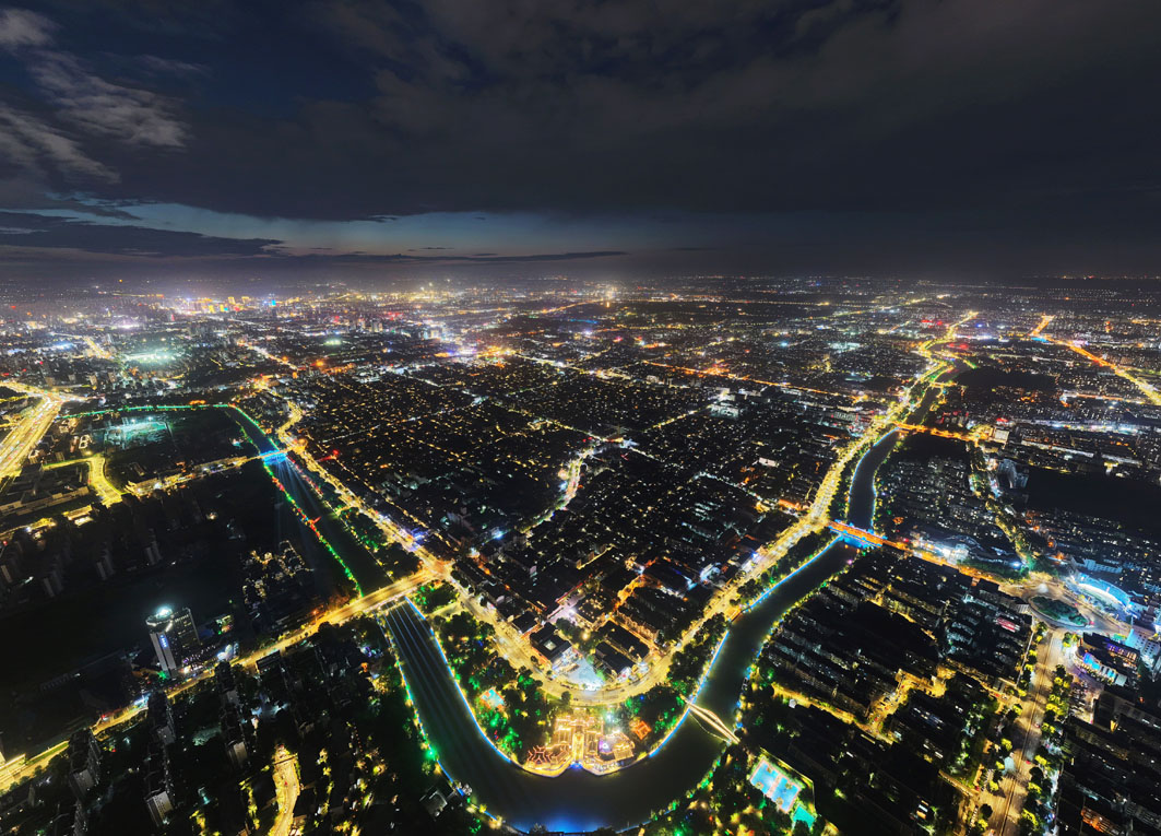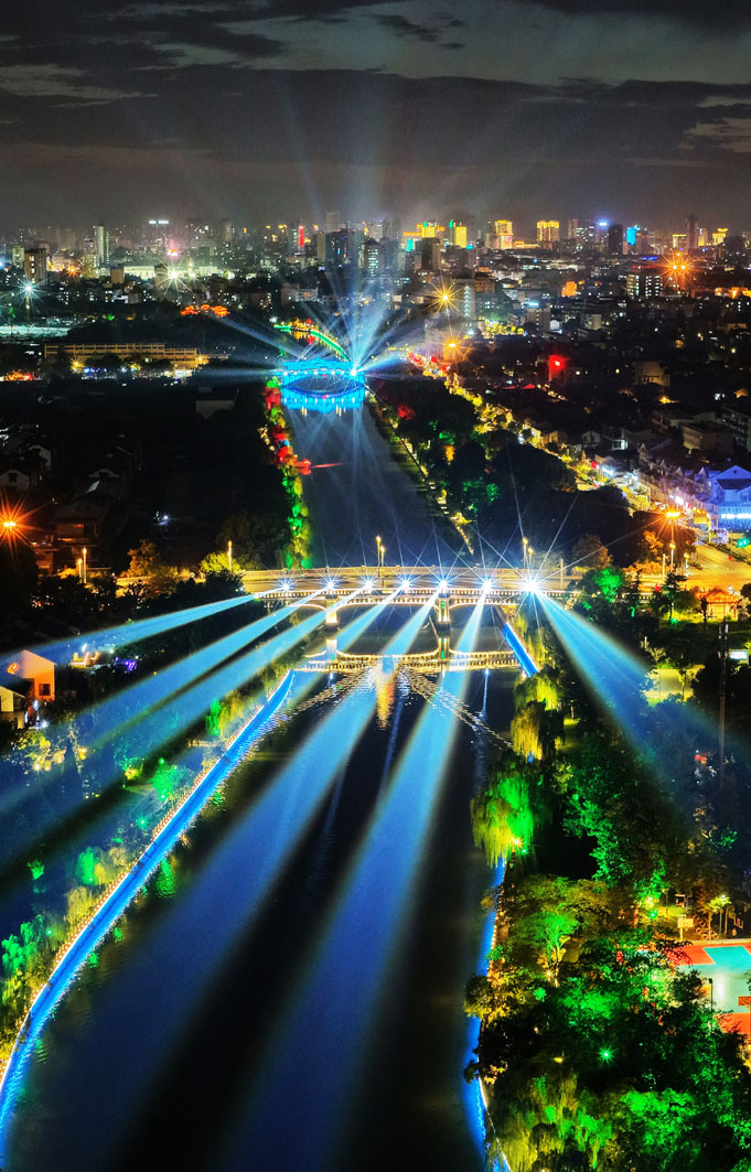 夜幕降临,古运河扬州段点亮灯光,游船往来穿梭,绚丽的光影秀与两岸古色古香的历史文化街区相得益彰,吸引众多游客前来休闲游玩。 孟德龙 摄