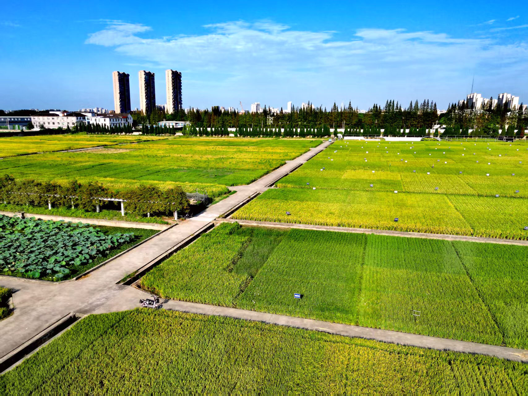 眼下,扬州里下河地区农科所迎来丰收季,田间水稻已由绿转黄。高空俯瞰,规整的稻田错落有致,色彩交织如巨型调色板,好一派丰收景象。 沙光明 司新利 摄