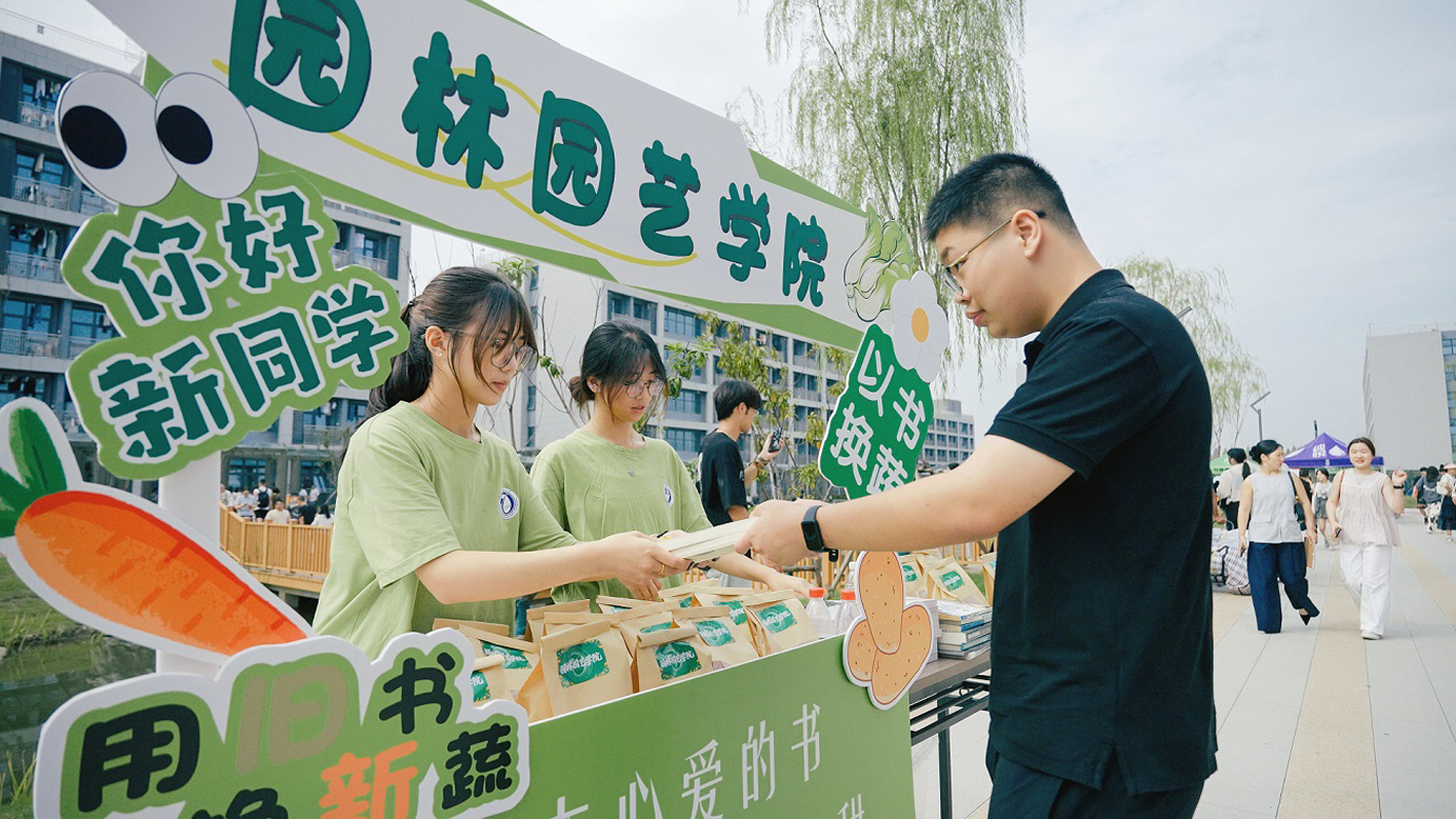 这里正在开展一场别开生面的“以书换蔬”活动,新生们用从家中带来的旧书,即可换得学长学姐亲手种植的黄瓜、小番茄、胡萝卜或多肉盆栽。每一份蔬菜、每一株绿植,不仅凝聚着农艺学子的汗水,更承载着知识与劳动相结合的育人理念。接下来,所有回收的旧书将捐赠至学校“一站式学生社区”,供学生免费取阅,持续传递书香与温暖。