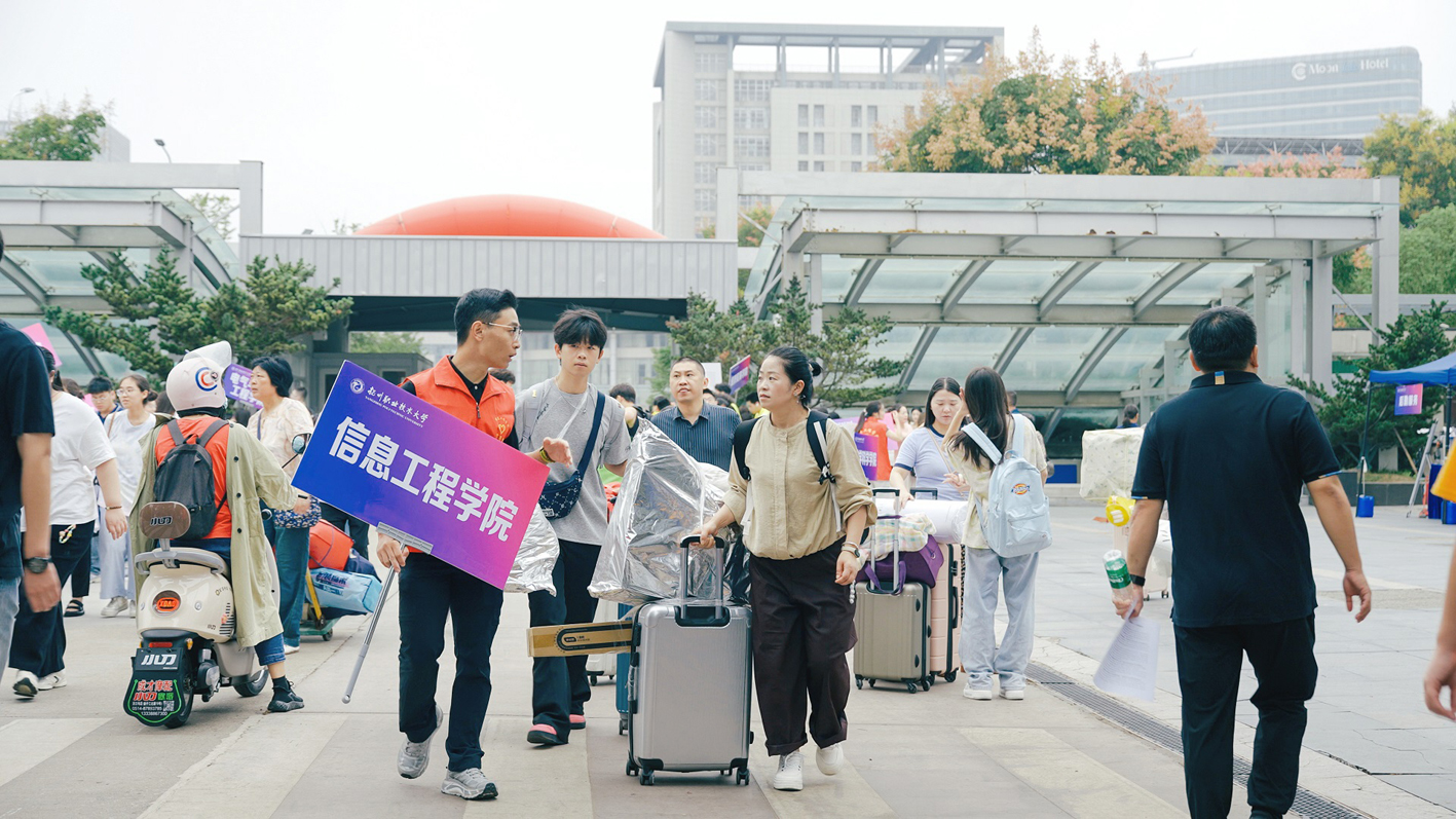 电子工程学院的迎新现场同样科技感十足。来自安徽的新生明浩报到后,学长打开学院自主开发的迎新小程序,将他的名字输入系统,左侧屏幕雷达扫描显示姓名,右侧大屏立刻动态点亮欢迎语和烟花效果,他的名字也在电子姓名墙上由灰转亮。更令他惊喜的是,这套系统是由通信和光电专业学生在老师指导下完成的专业实践项目。全部新生报到完成后,所有姓名将拼成“邮”字,突出高邮湖校区特色。“看到自己的专业这么有用,我特别期待今后的学习生活。”明浩兴奋地说。