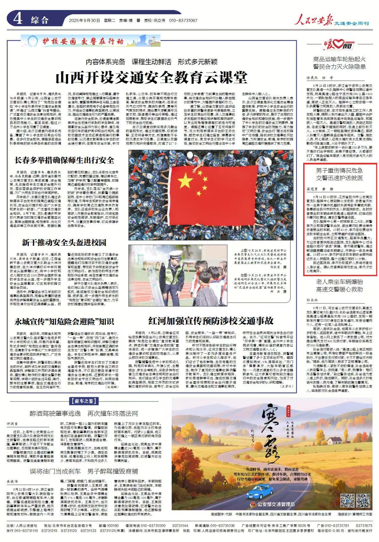 9月30日出版的《人民公安报》以《男子重伤情况危急 交警迅速护送就医》为题,报道了扬州交警对路口进行“绿波”保障,保障外省求医患者顺利到达苏北人民医院。