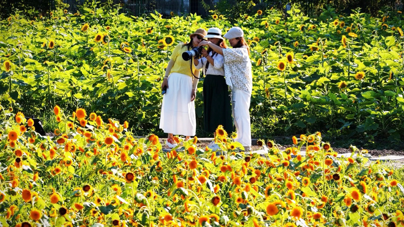 连绵起伏的向日葵植株挺拔,硕大的花盘迎着秋日暖阳争相绽放,金黄色的花瓣舒展,构成一幅壮丽而温暖的画卷。花田间,游人或漫步于蜿蜒的观景小径,或驻足拍照留影。不少摄影爱好者时而架起“长枪短炮”,时而放飞无人机,捕捉这秋日里难得的灿烂景致。
