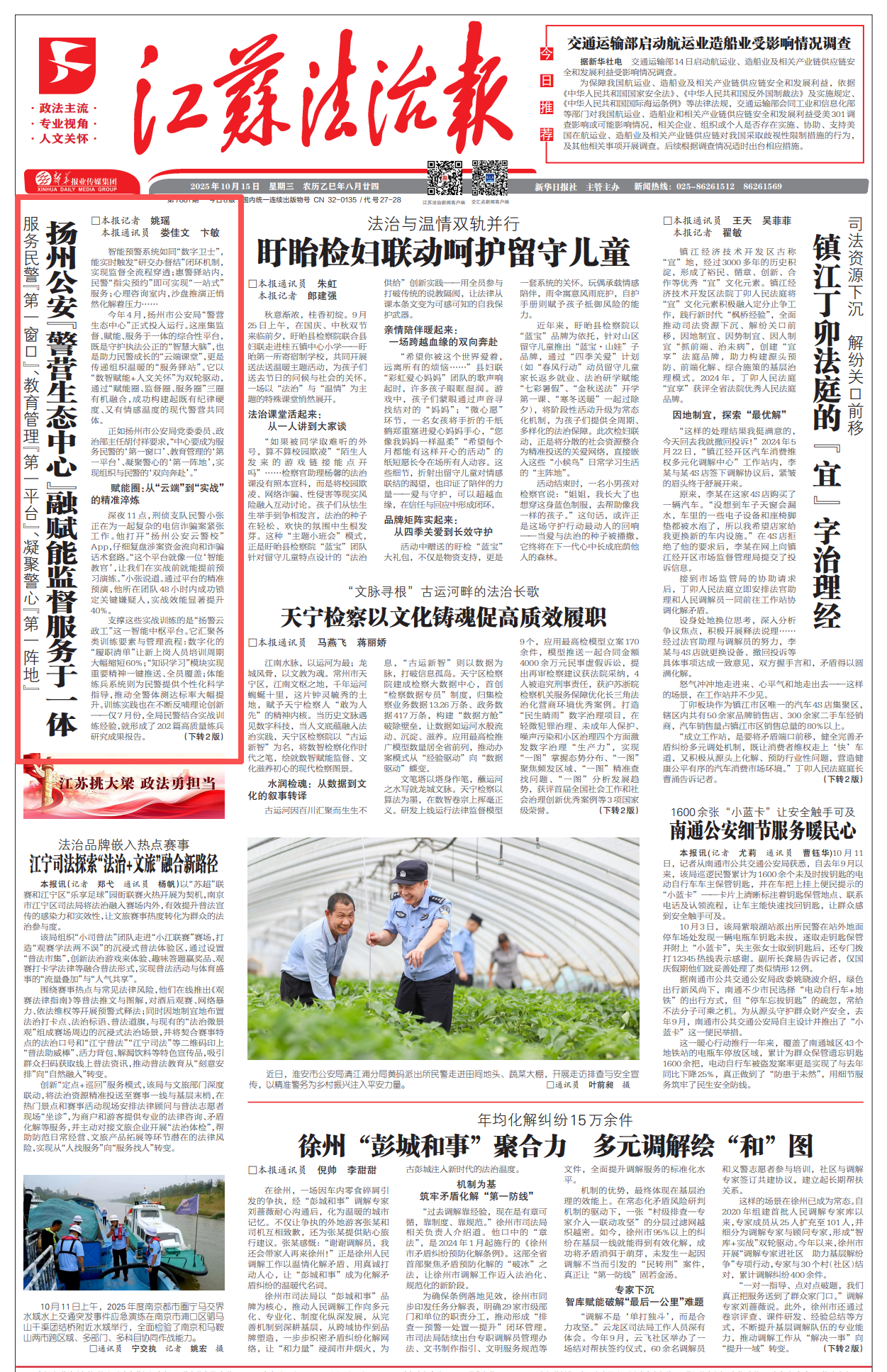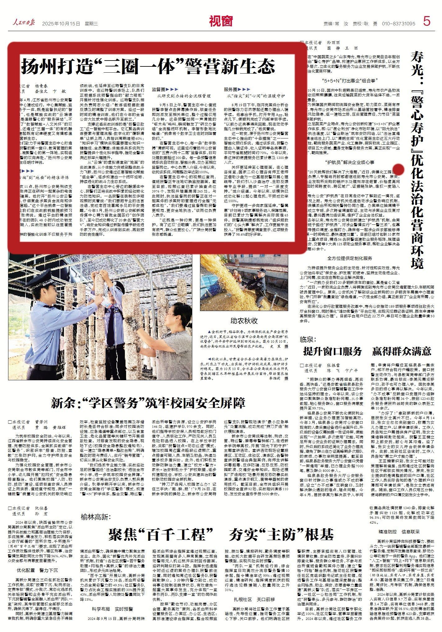 10月15日出版的《人民公安报》《江苏法治报》以《扬州打造“三圈一体”警营新生态》《扬州公安“警营生态中心”融赋能监督服务于一体》为题,报道了今年4月,扬州市公安局警营生态中心建成运行,不仅实现了“数智赋能+人文关怀”的双轮驱动,还通过“三圈一体”的有机融合,构建起既有纪律硬度又有情感温度的警营新生态。