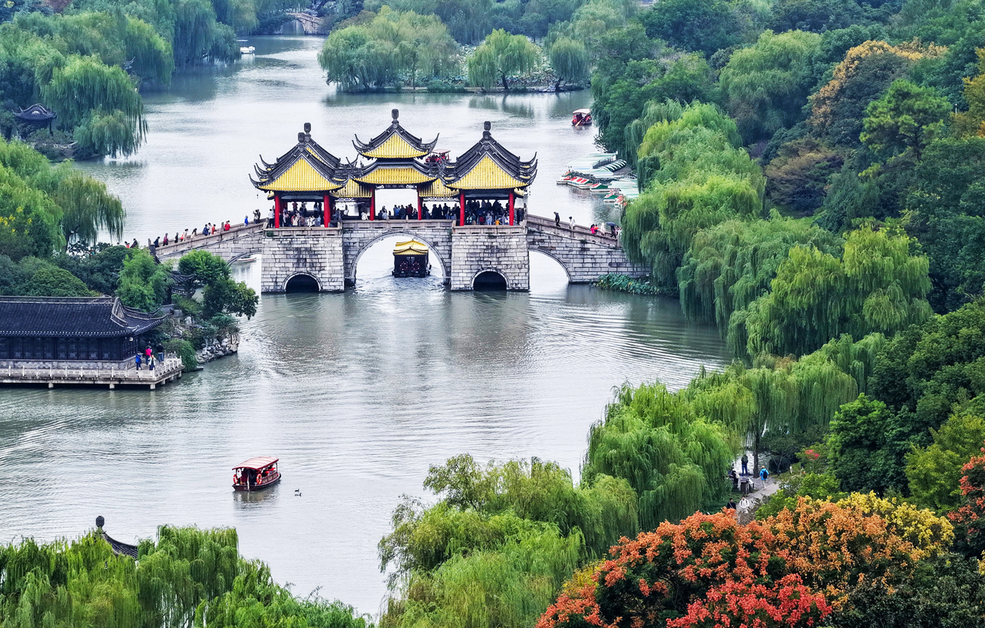 秋染神州,各地美景引客来。瘦西湖景区色彩斑斓、秋景如画,吸引了众多游客前来观光游玩。