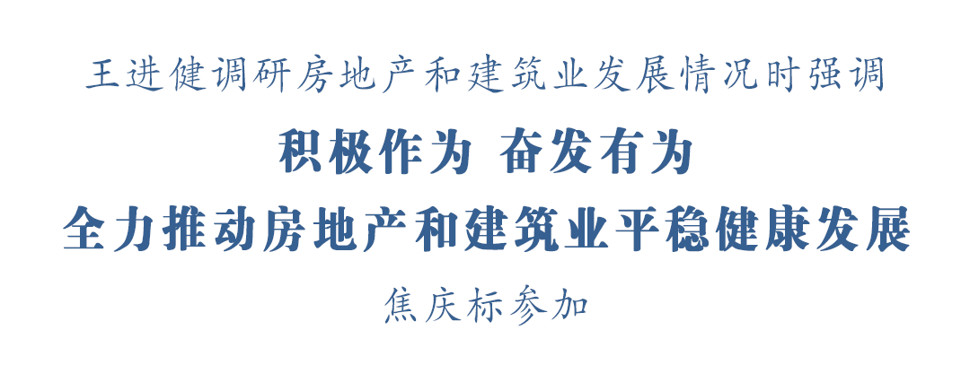 10月22日上午,市委书记王进健专题调研房地产和建筑业发展情况。他强调,要深入贯彻落实习近平总书记关于住房和城乡建设工作的重要论述和重要指示批示精神,积极作为、奋发有为,探索构建房地产发展新模式,促进传统建造向新型建造转型,全力推动房地产和建筑业平稳健康发展,为全市经济社会高质量发展提供有力支撑。市委副书记、秘书长焦庆标参加活动。