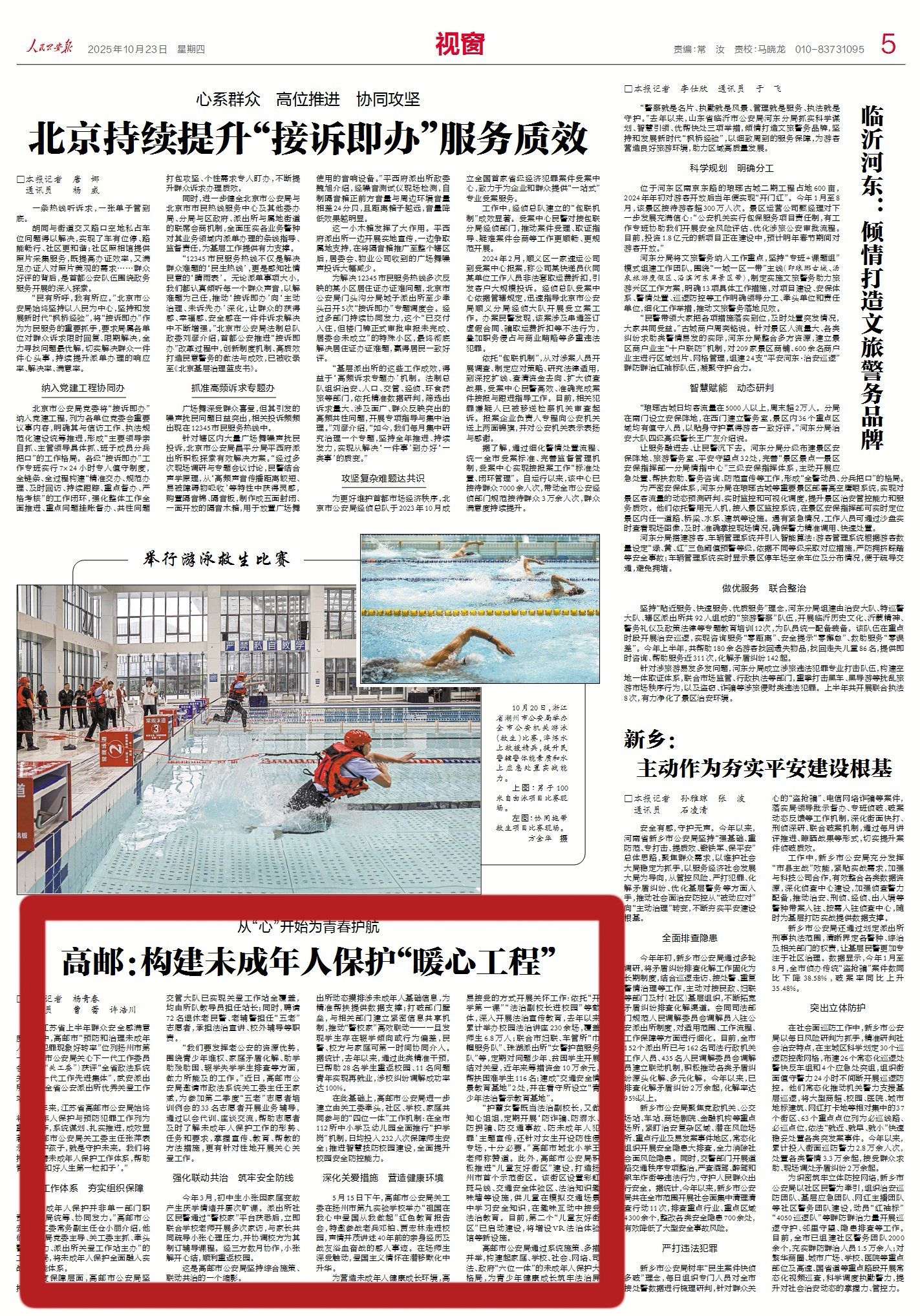 10月23日出版的《人民公安报》以《高邮:构建未成年人保护“暖心工程”》为题,报道了高邮市公安局始终将未成年人保护与预防犯罪工作列为重点工作,系统谋划、扎实推进,成效显著。
