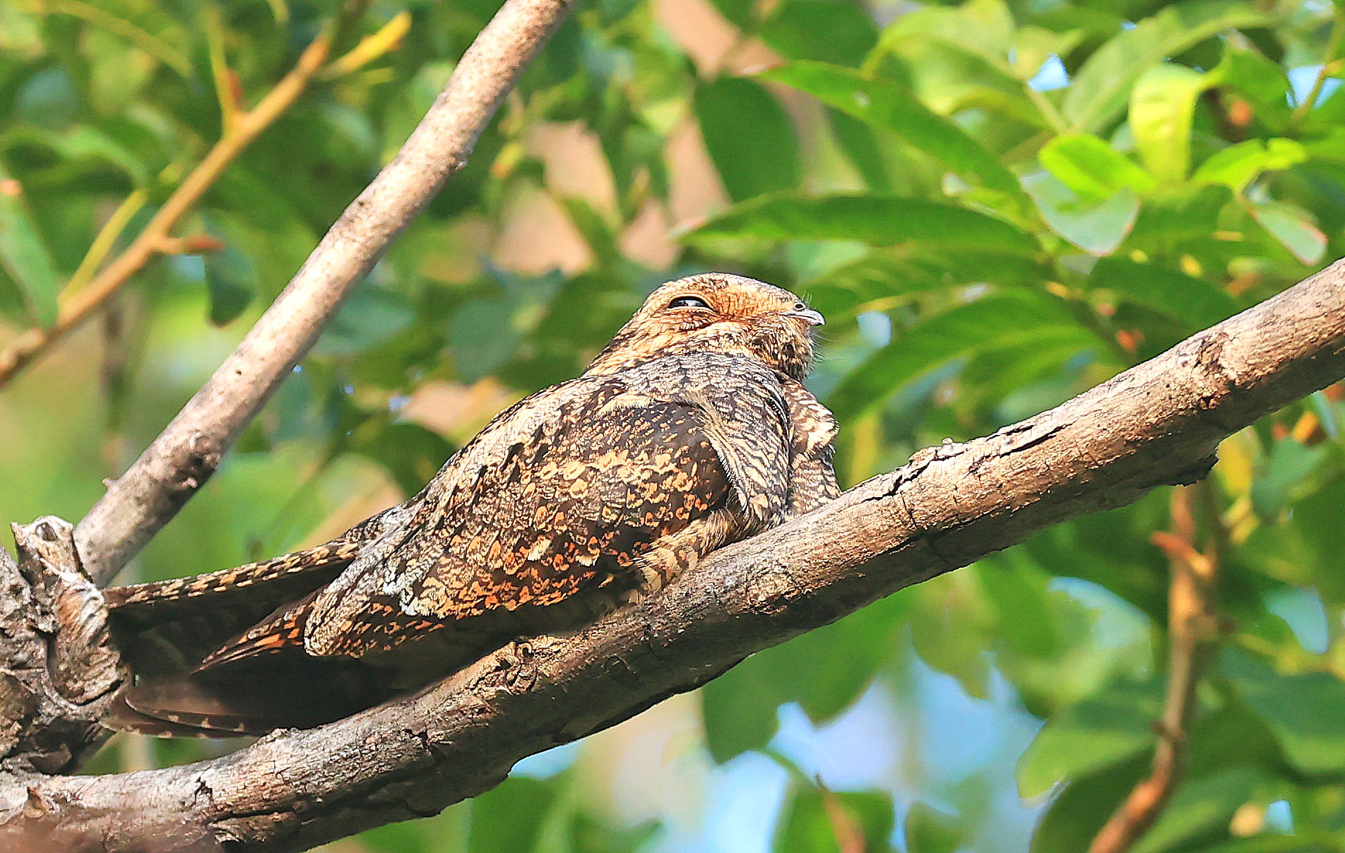 普通夜鹰是夏候鸟,目前是它们的迁徙季节。普通夜鹰的迁徙特点是白天休息,晚上飞行。这只普通夜鹰正伏在一根高高的树干上睡觉,由于它的羽毛与树干极其相似,很难被发现。