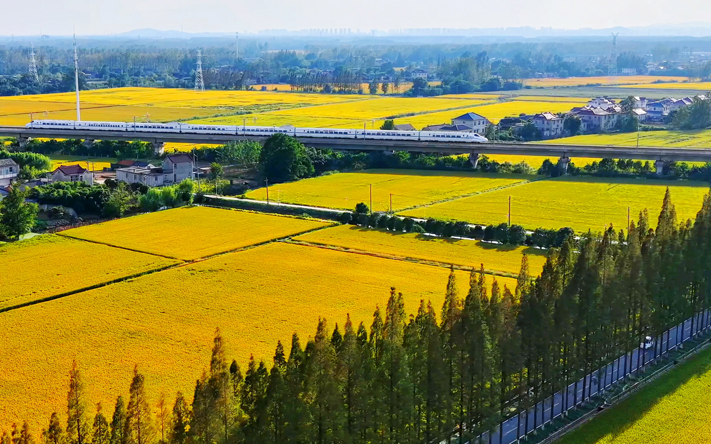 近日,广陵区李典镇成片稻田如铺展开的金色绸缎,与白墙黛瓦的农房相映成趣。远处,一列高铁列车呼啸而过。动静之间勾勒出一幅美丽田园画卷。