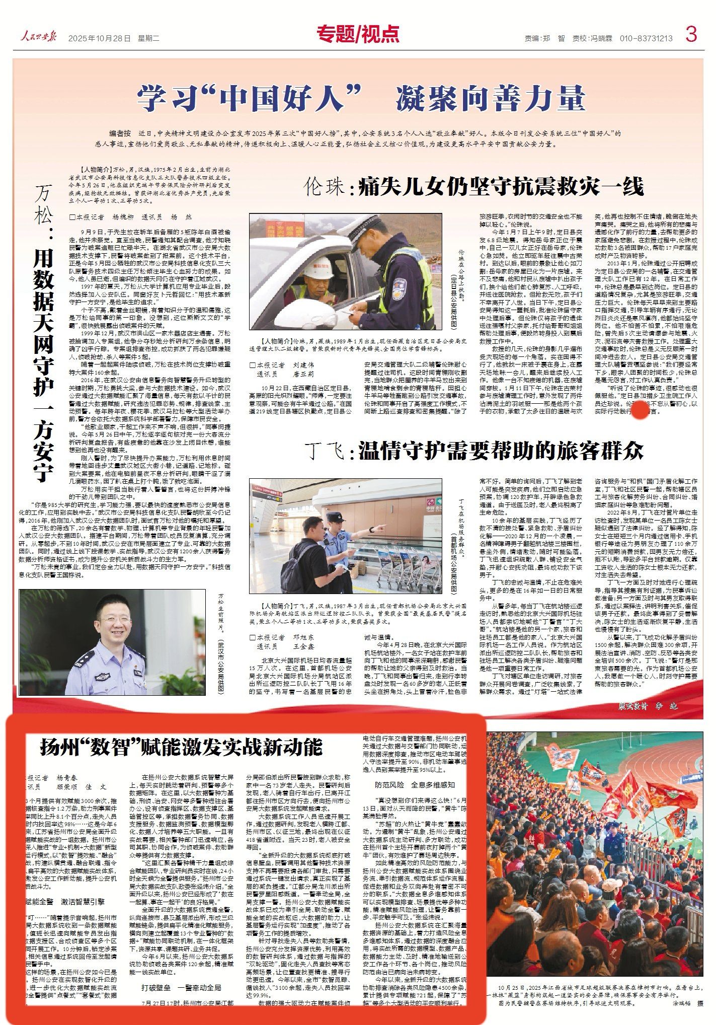 10月28日出版的《人民公安报》以《扬州“数智”赋能激发实战新动能》为题,报道了扬州市公安局深入推进“专业+机制+大数据”新型警务运行模式,以“数智”提效能、“融合”促实战,构建纵横贯通、融合联通、指令畅通、扁平高效的大数据赋能实战体系,不断激发公安工作新动能,提升公安机关新质战斗力。