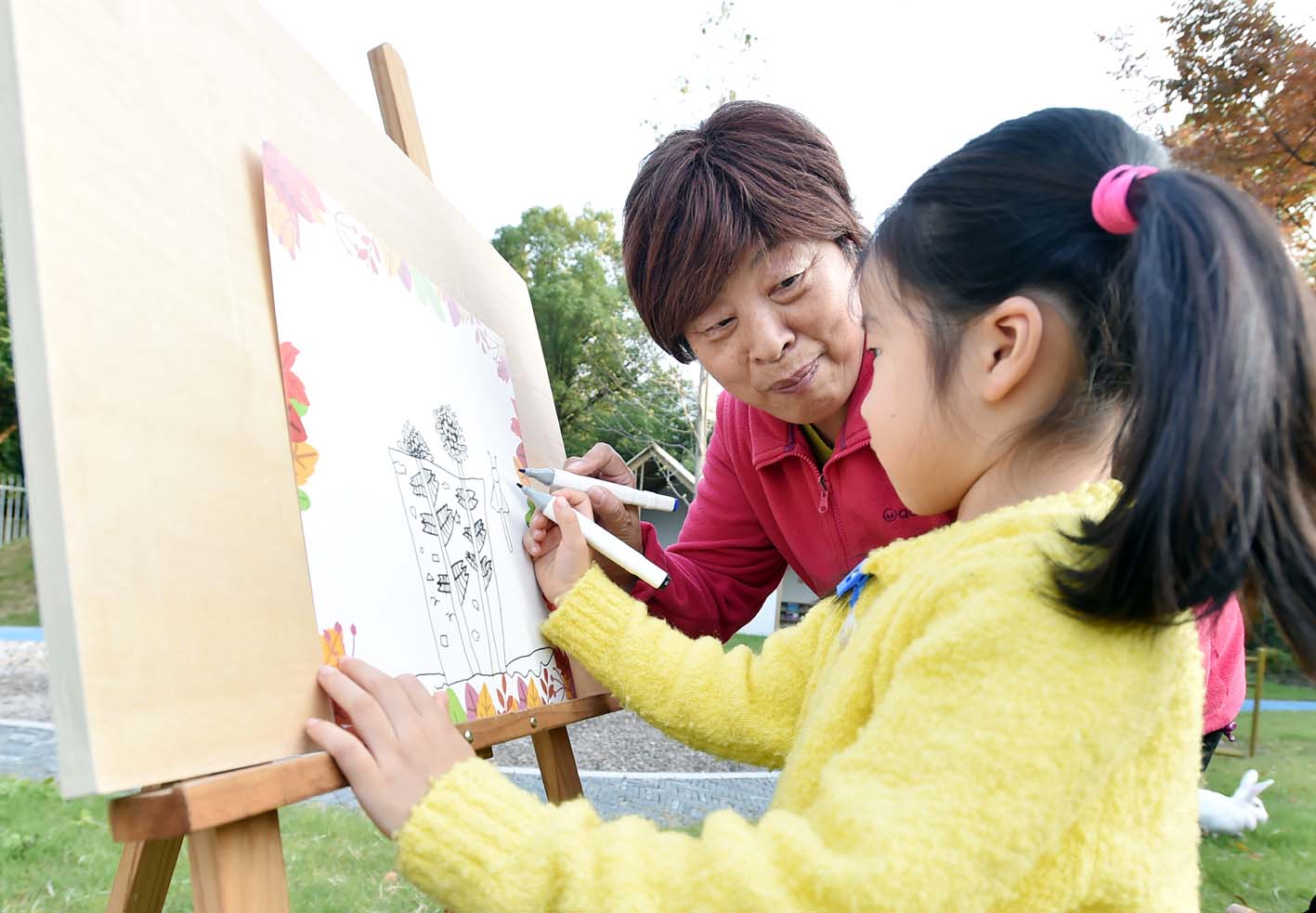 10月29日,扬州市老干部书画研究会联合健身器材爱心企业,组织一支“夕阳红”助教关爱公益团队走进扬州市机关第三幼儿园,开展以“大手牵小手”为主题的送书画、送健康、送祝福——“三送”联谊活动。图为“夕阳红”奶奶辅导小朋友户外写生。 庄文斌 摄