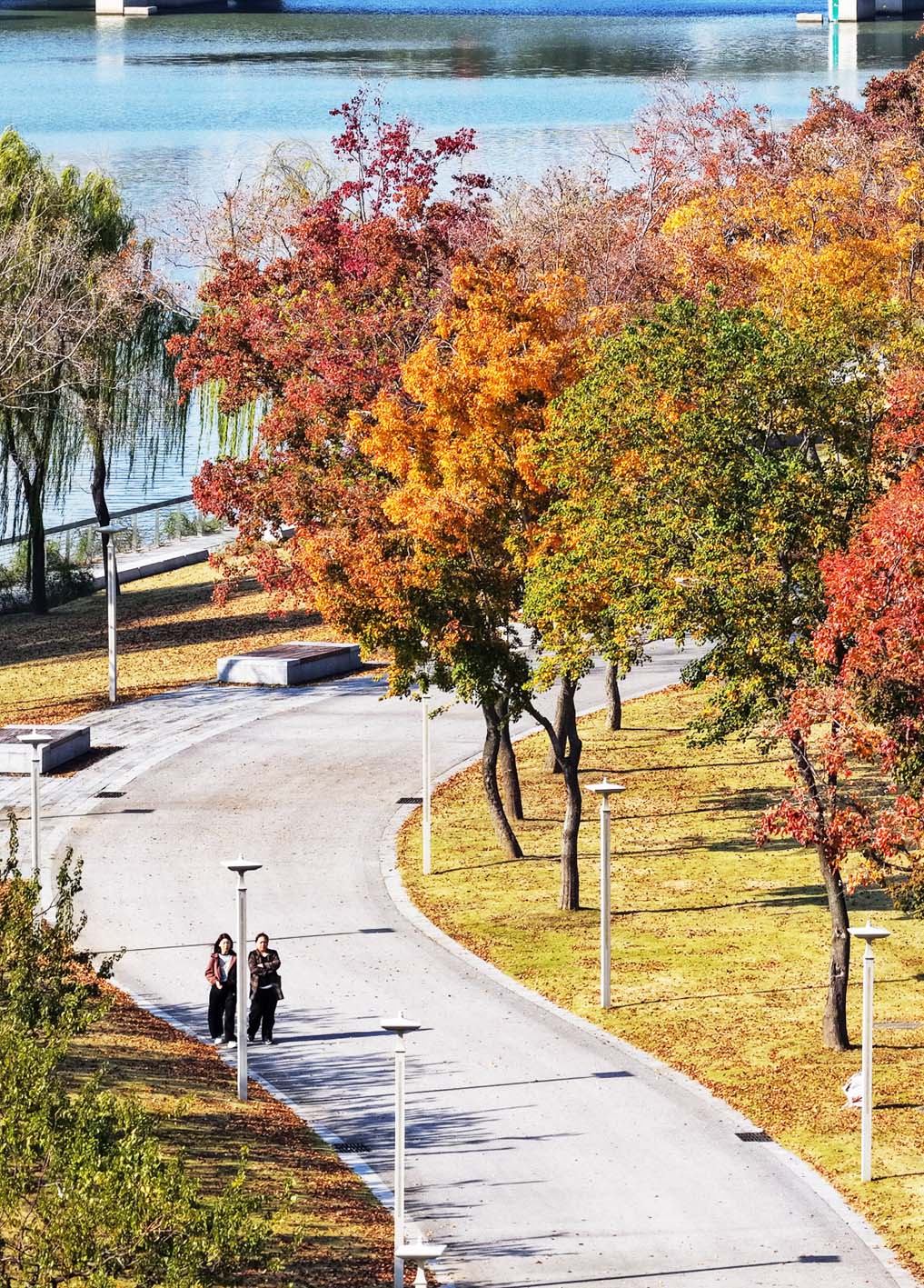 11月13日,运河三湾生态文化公园内,各色林木五彩斑斓,构成独特的初冬画卷,吸引不少游客前来休闲游玩。