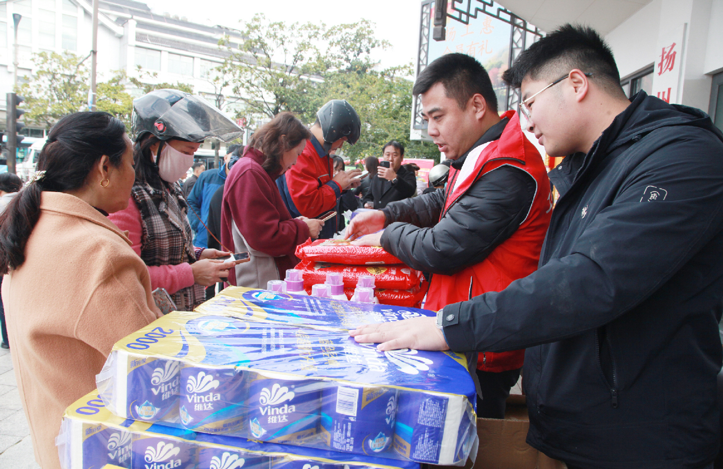 快递小哥们领取暖新礼包。 张丙涛 摄