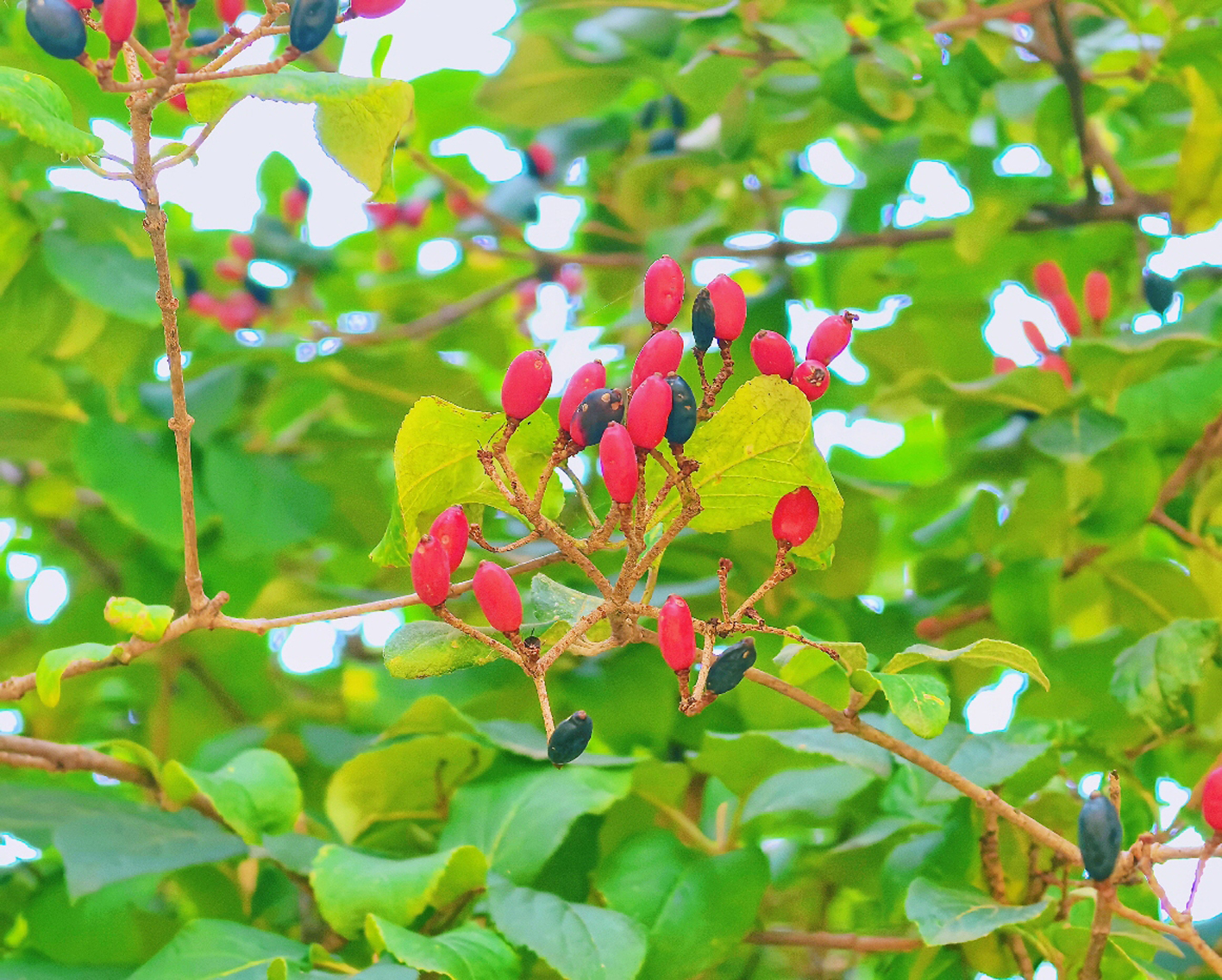 “维扬一株花,四海无同类”,在扬州多家公园与景区内,颜色鲜艳的琼花果高挂枝头,已成为一道道亮丽的自然景观,吸引不少市民驻足观赏。而琼花果实的颜色并非一成不变。