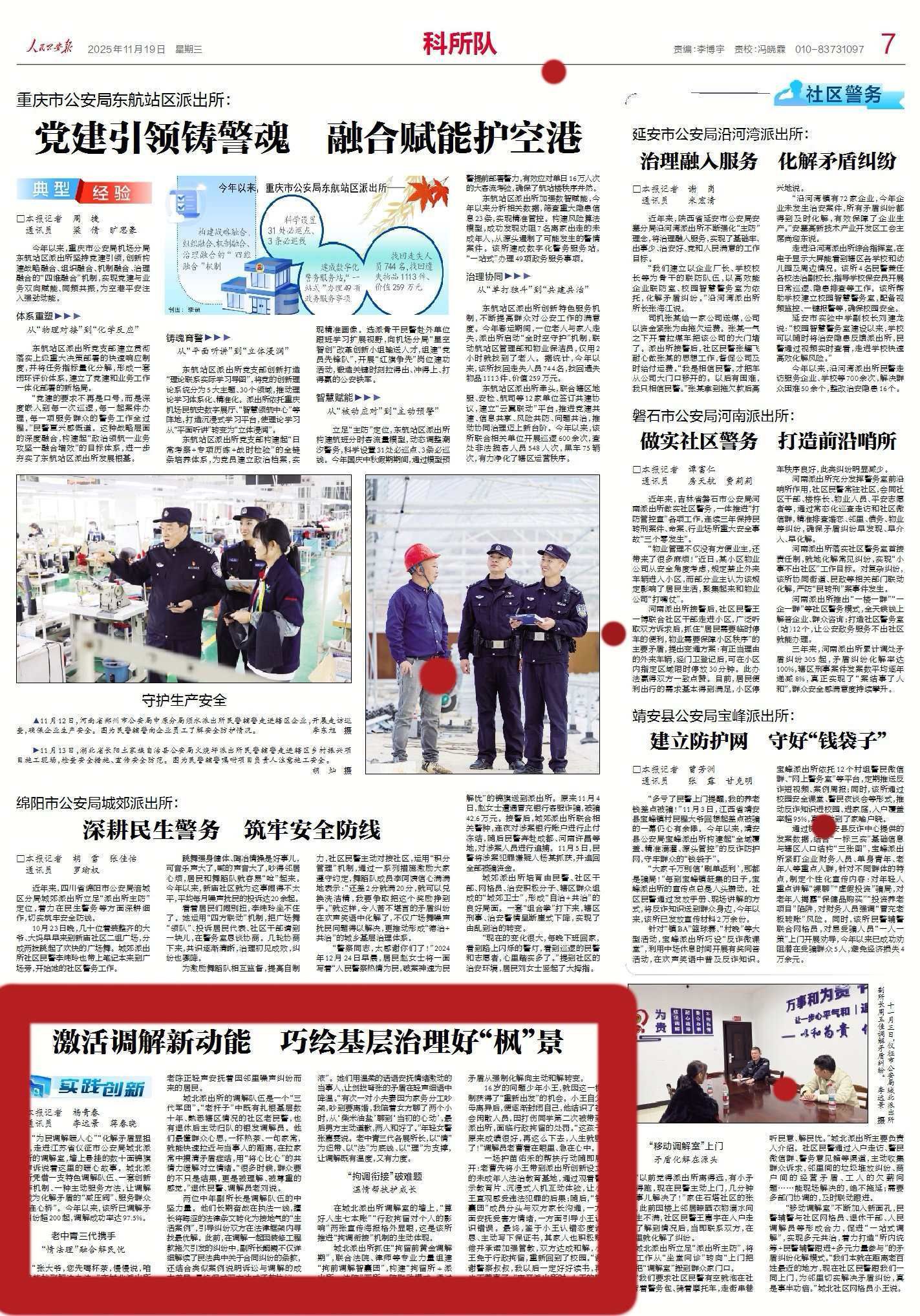 11月19日出版的《人民公安报》以《激活调解新动能 巧绘基层治理好“枫”景》为题,走进江苏省仪征市公安局城北派出所的调解室,报道了这里老中青三代的“一站式调解”。城北派出所凭借一支特色调解队伍、一套创新工作机制、一种主动服务方法,让调解室成为化解矛盾的“减压阀”、服务群众的“连心桥”。