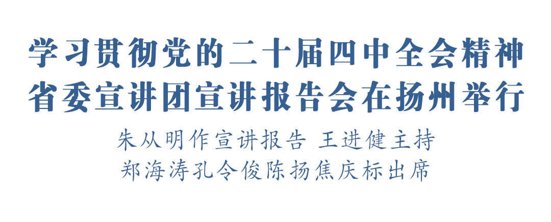 扬州网讯(记者 伊然 仁辂 季晨) 根据省委统一安排,11月19日,学习贯彻党的二十届四中全会精神省委宣讲团宣讲报告会在扬州举行。省委宣讲团成员,省人力资源和社会保障厅党组书记、厅长朱从明作宣讲报告。市委书记王进健主持报告会。市委副书记、市长郑海涛,市人大常委会主任孔令俊,市政协主席陈扬,市委副书记、秘书长焦庆标出席。