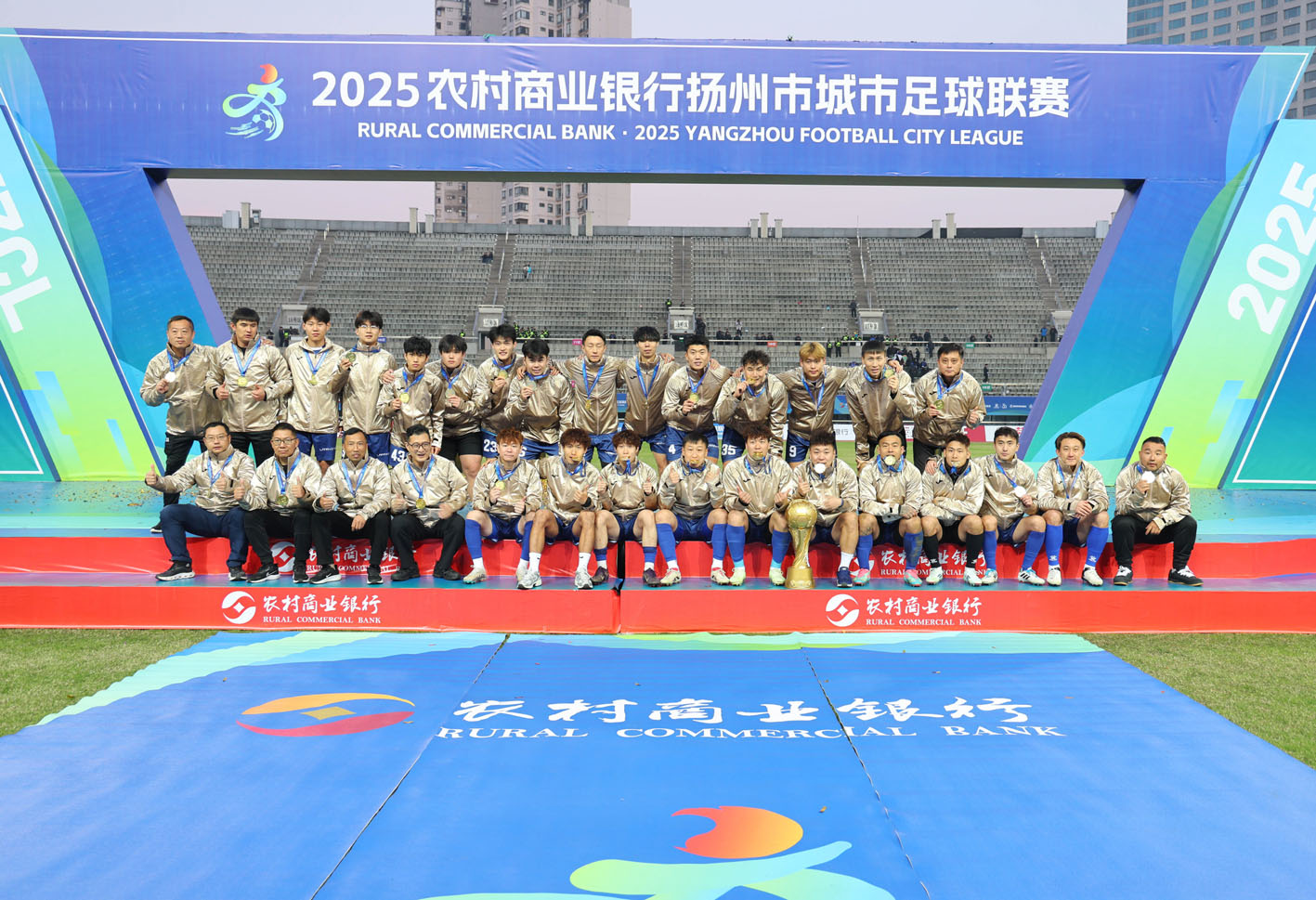 午后阳光下,体育公园体育场彩旗招展、人声鼎沸,欢呼声此起彼伏。赛前进行了江都龙舞《龙腾盛世》等暖场表演,随后,扬州市城市足球联赛冠军奖杯、联赛会徽、9支县域组球队队徽依次入场。