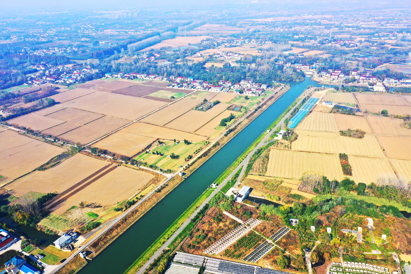 初冬时节,眺望扬州西郊田园乡村,清澈的河流环绕,村庄清新整洁,成片的良田麦子已播种结束,大地尽现醉人的美丽乡村冬日别样风韵。 程曦 摄