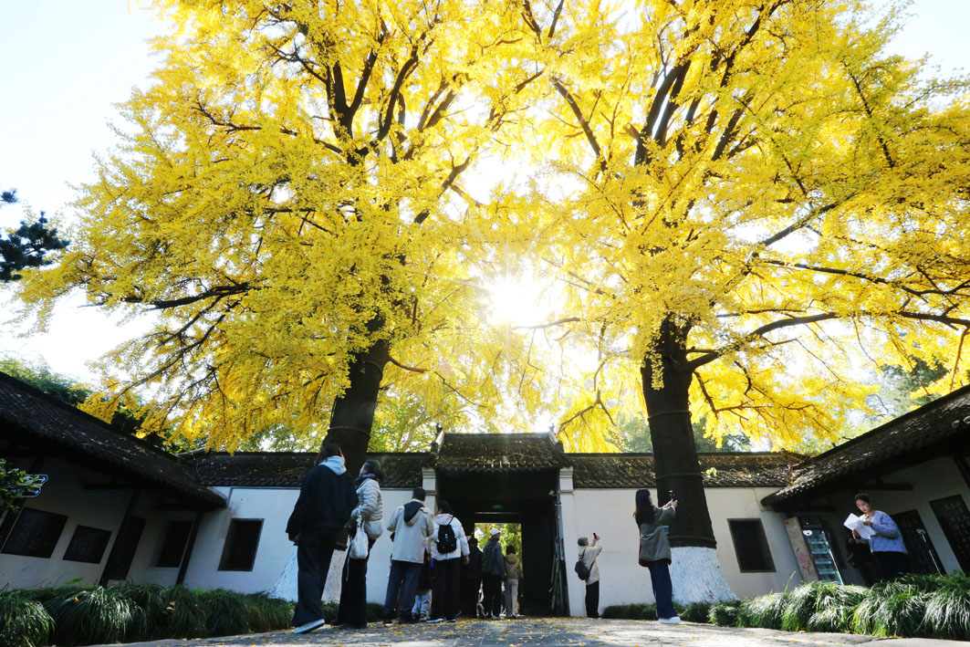 初冬时节,史可法纪念馆的银杏进入最佳观赏期,满目金黄的银杏叶扮美庭院,众多游客纷至沓来,欣赏银杏美景。