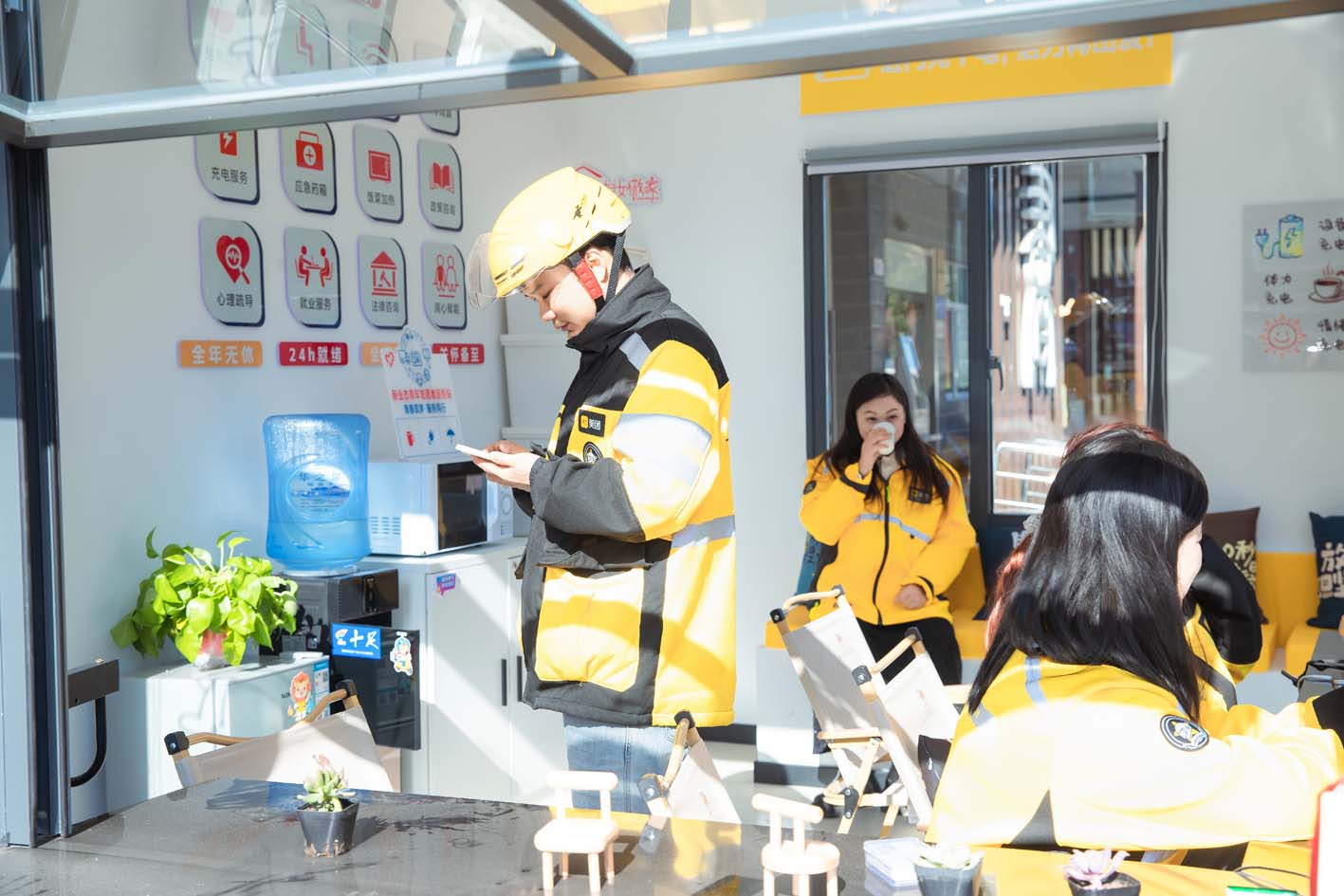 在夯实基础服务的同时,开新驿家也在不断拓展功能、整合资源,推动站点从“休息点”升级为“服务综合体”。街道构建了组织部门、业务主管部门、平台企业、街道社区等多方联动机制,充分统筹机关、群团、社区、企业等力量,推动医疗、教育、法律等资源下沉。站点还与周边的停车场、自助充电桩、自助洗车点等设施互联共享,极大提升了服务的便利性。