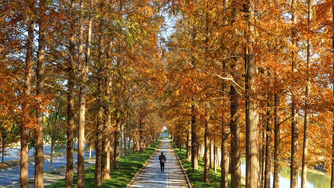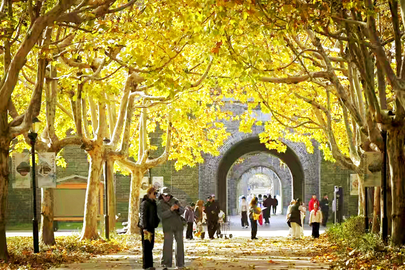 午后,阳光洒满宋夹城,这里藏着一条被阳光“吻”过的梧桐大道。高大的悬铃木枝丫交错,金黄与橙红交织,细碎的阳光穿过叶隙,像撒一地碎金,这条“金光大道”成了现实版的童话世界。 季利 程曦 摄