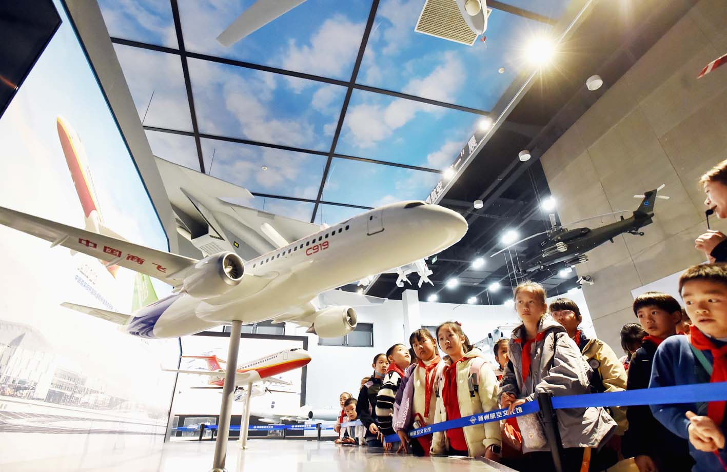 在“国际民航日”即将到来之际,我市一批中小学生走进扬州航空馆,了解我国航空发展史,沉浸式体验航空文化,种下一个“航空梦”。图为,孩子们在参观C919大飞机模型。 庄文斌 摄