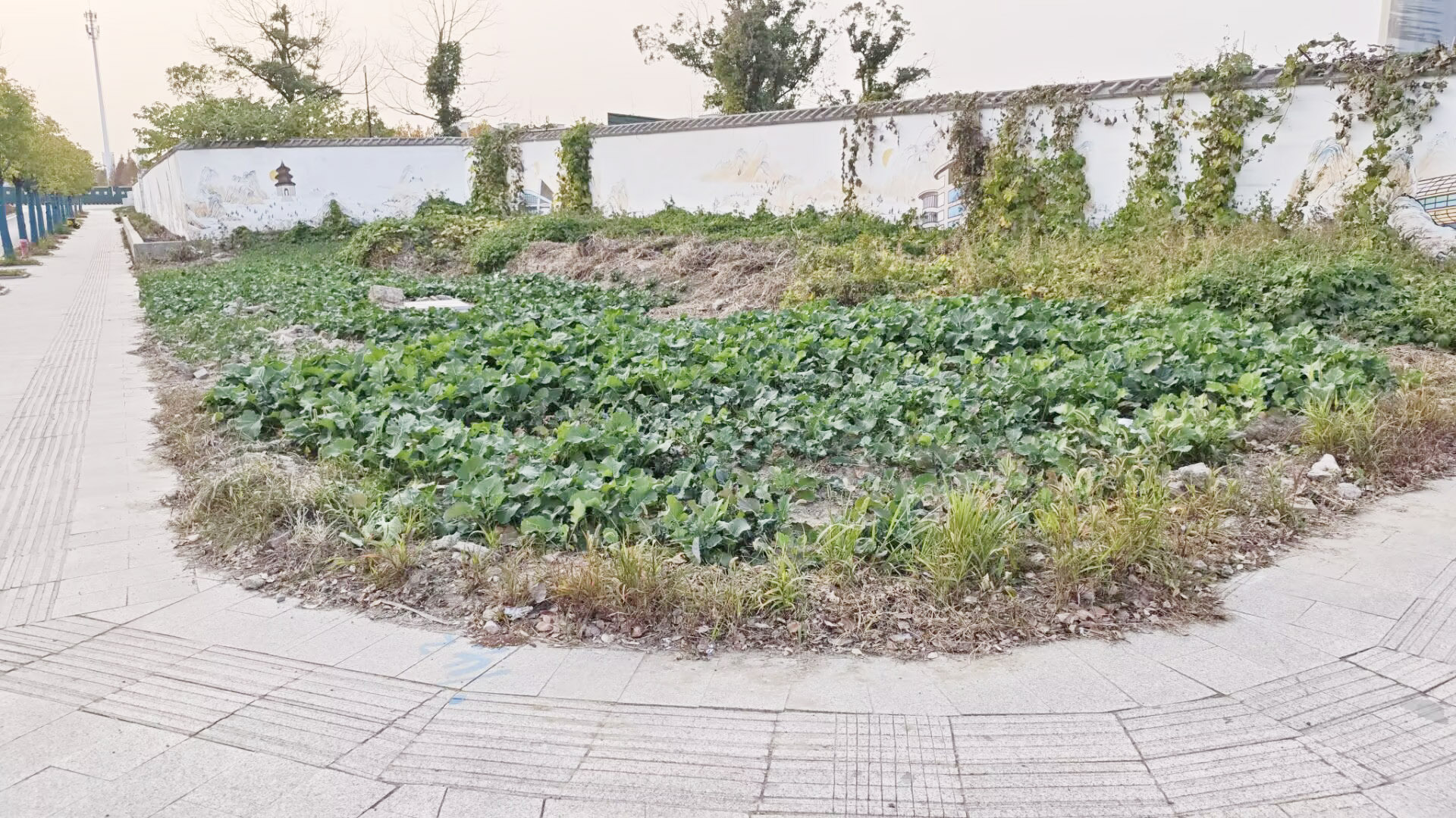 在现场记者看到,交叉口西北侧,人行道边上,围墙外有一小块土地,靠近后可以看到,土地已被人开辟成大小不一的菜田,种上了蔬菜。因为这块土地紧靠着人行道,记者从人行道经过时,可以清楚看到种的菜。