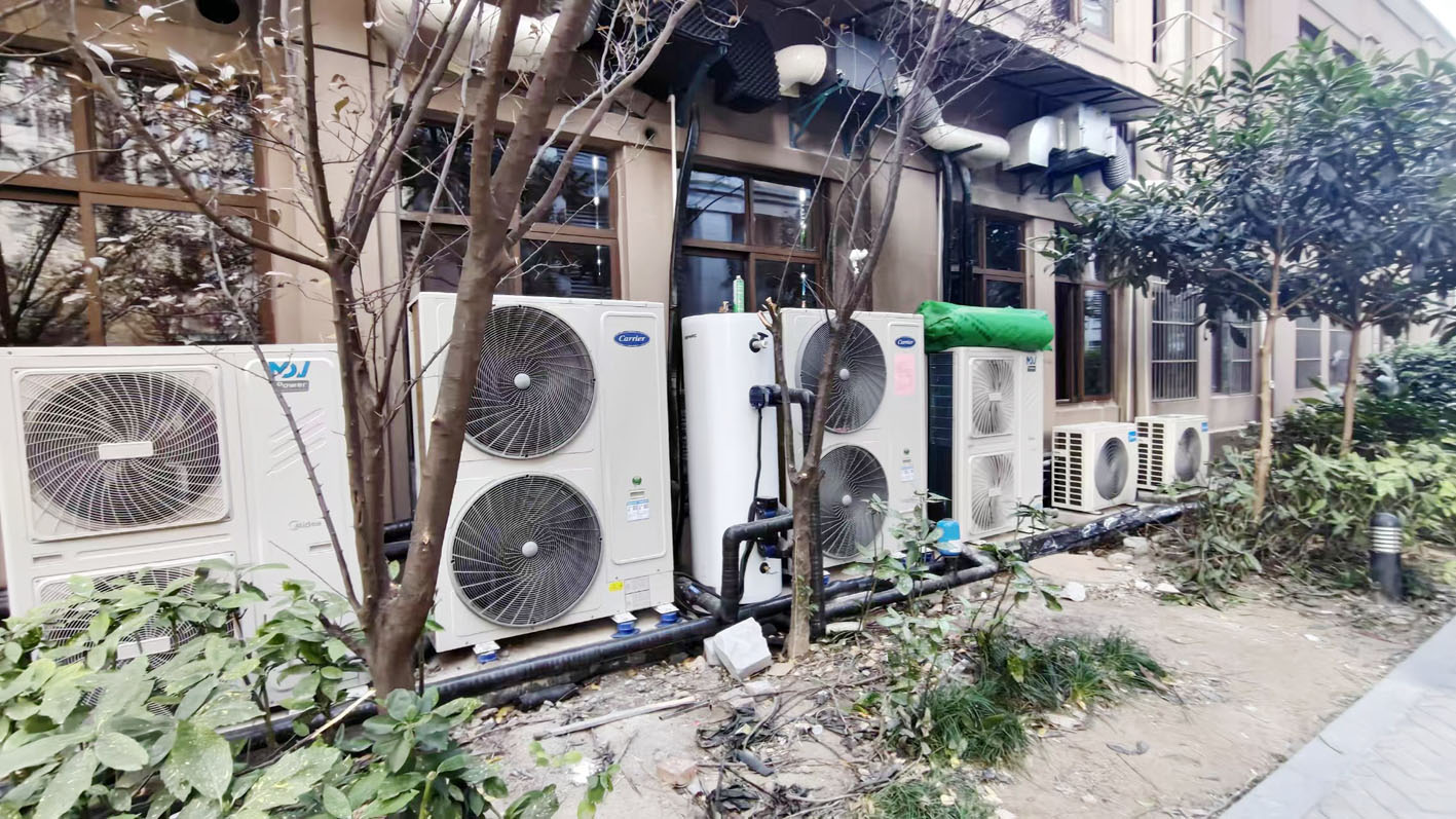 住宅楼附近摆放多个空调外机