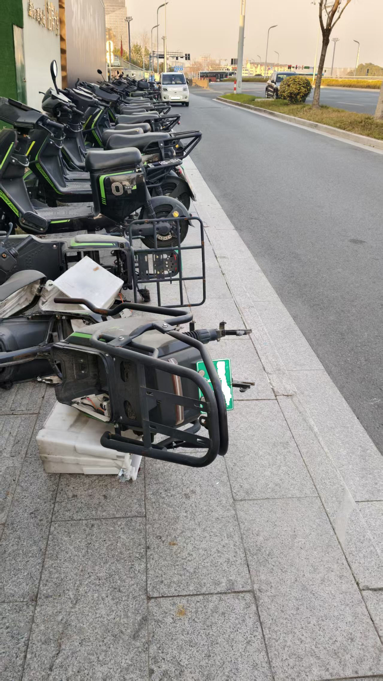 【记者探访】这两天,记者来到大世界国际广场附近的运河南路,看到附近的人行道确实停了一排电动车,有20辆左右,有的还压盲道停放。记者观察发现,这些车辆外观和设施都差不多,有的显得有些陈旧,坐垫、踏板、车把手位置有明显的灰尘,个别车辆“倒地不起”,零部件有明显损坏。