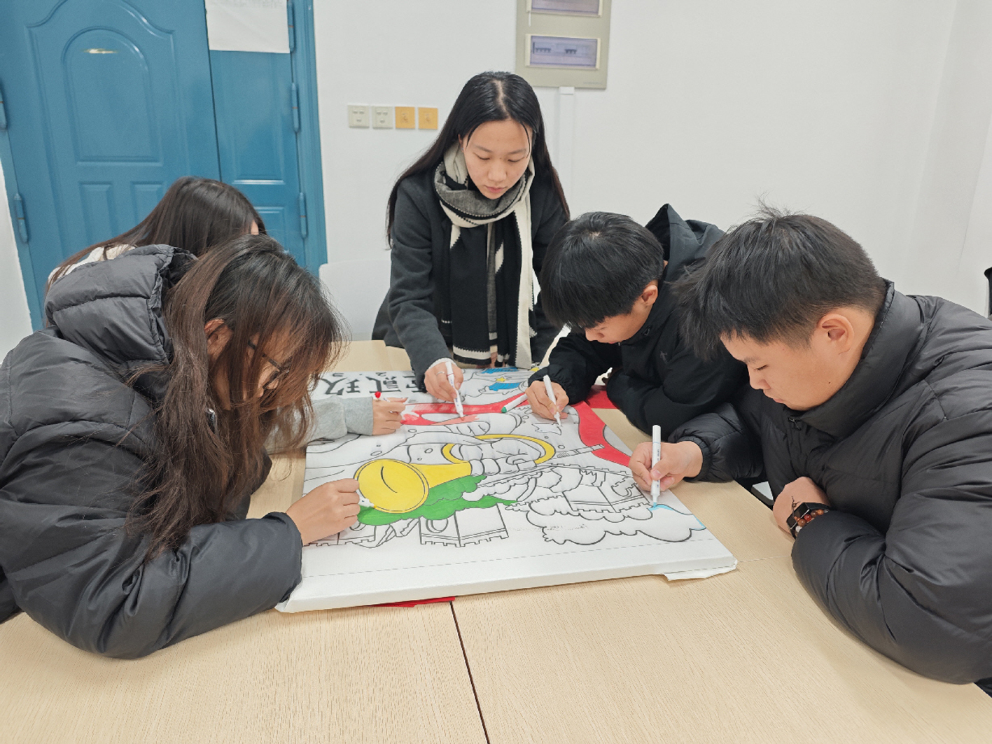 近日,扬州大学土木工程系学生党支部携手建筑2501班,开展了一场以“铭记历史壮举,勇担时代使命”为主题的党团共建纪念活动。同学们通过剪纸、手绘海报等形式重温历史,在艺术创作中展现青春担当。图为同学们集体创作“集结号”海报作品。 黄晓 池渝悠 摄