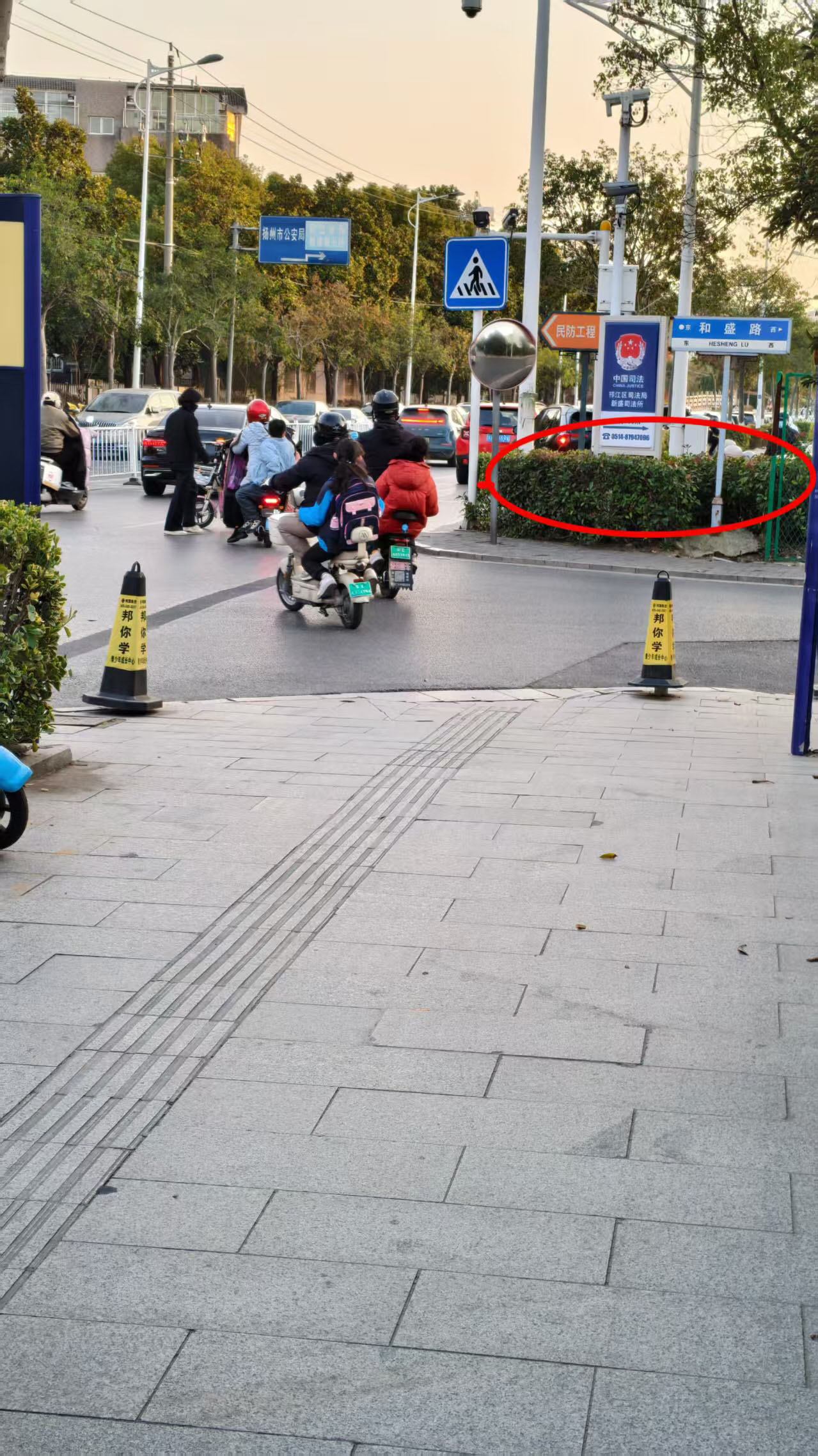 【家长建议】8日下午4点半前后,记者来到育才小学西区校附近的绿杨路,看到一批批家长守在学校门口或附近,有开车的,也有骑车的。记者观察发现,当有骑车家长接到孩子后,他们沿附近人行道骑行至绿杨路与和盛路交叉口南侧时,被路边一处绿化带挡住,只能在台阶以下的车道骑行一小段距离,之后再骑上台阶,沿人行道往南骑行。