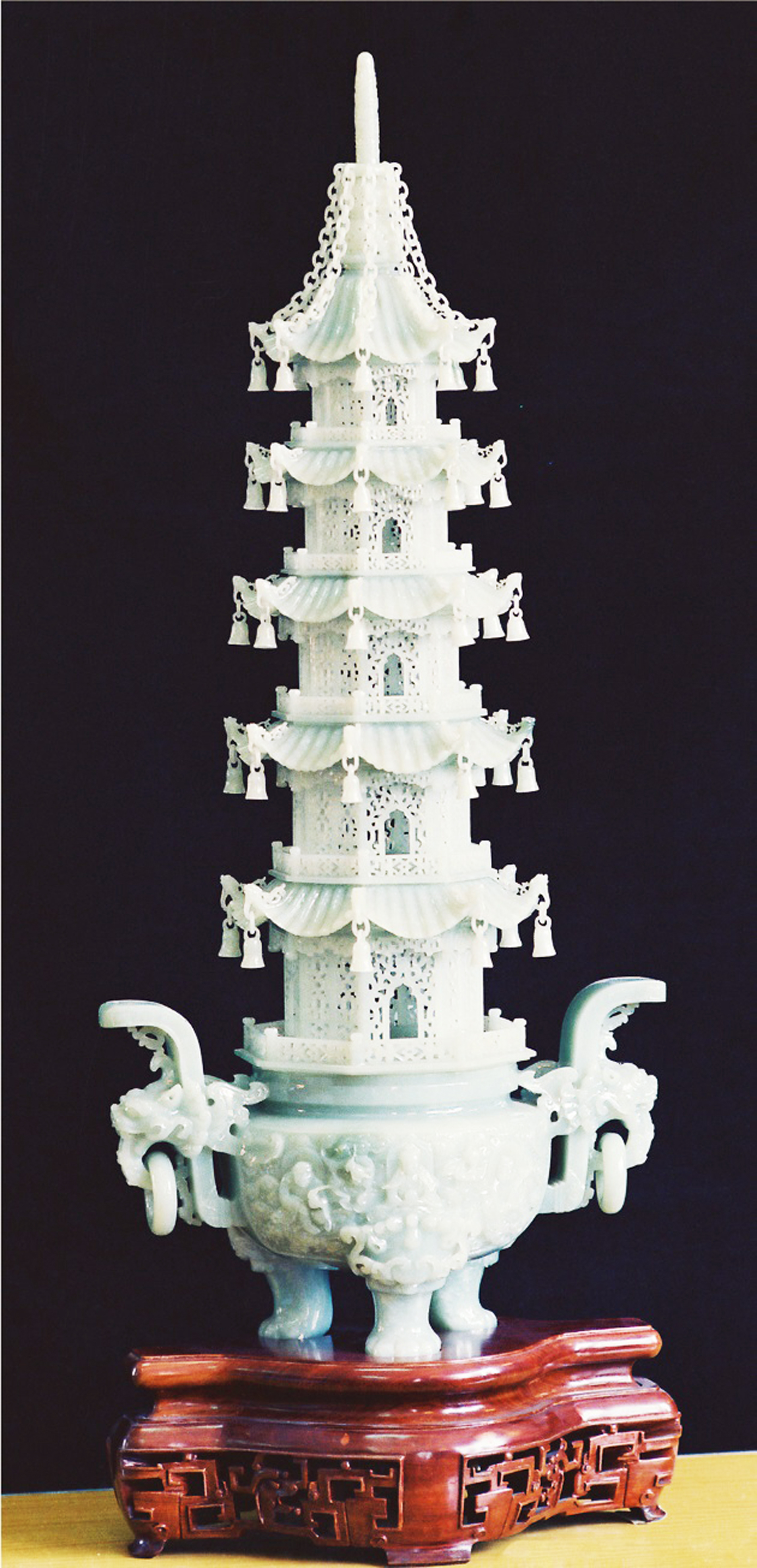 《宝塔炉》选用新疆和田白玉雕刻而成,构思精美。以人物和炉瓶相结合的形式,把圆炉的优美造型和高耸的宝塔融为一体。下部是稳重浑厚的三足元炉,炉面雕有佛像六尊,动态各异;炉身上端是五层八角宝塔,层层镂空,每层塔门和窗扇式样各不雷同;塔顶挂着8根共有128个细圈的玉链,紧连在塔的飞檐上,翘角下各悬风铃。结构严谨,琢工精细,形成了端庄厚重中显挺秀精巧的扬州玉器风格。1985年被国家作为珍品永久收藏。