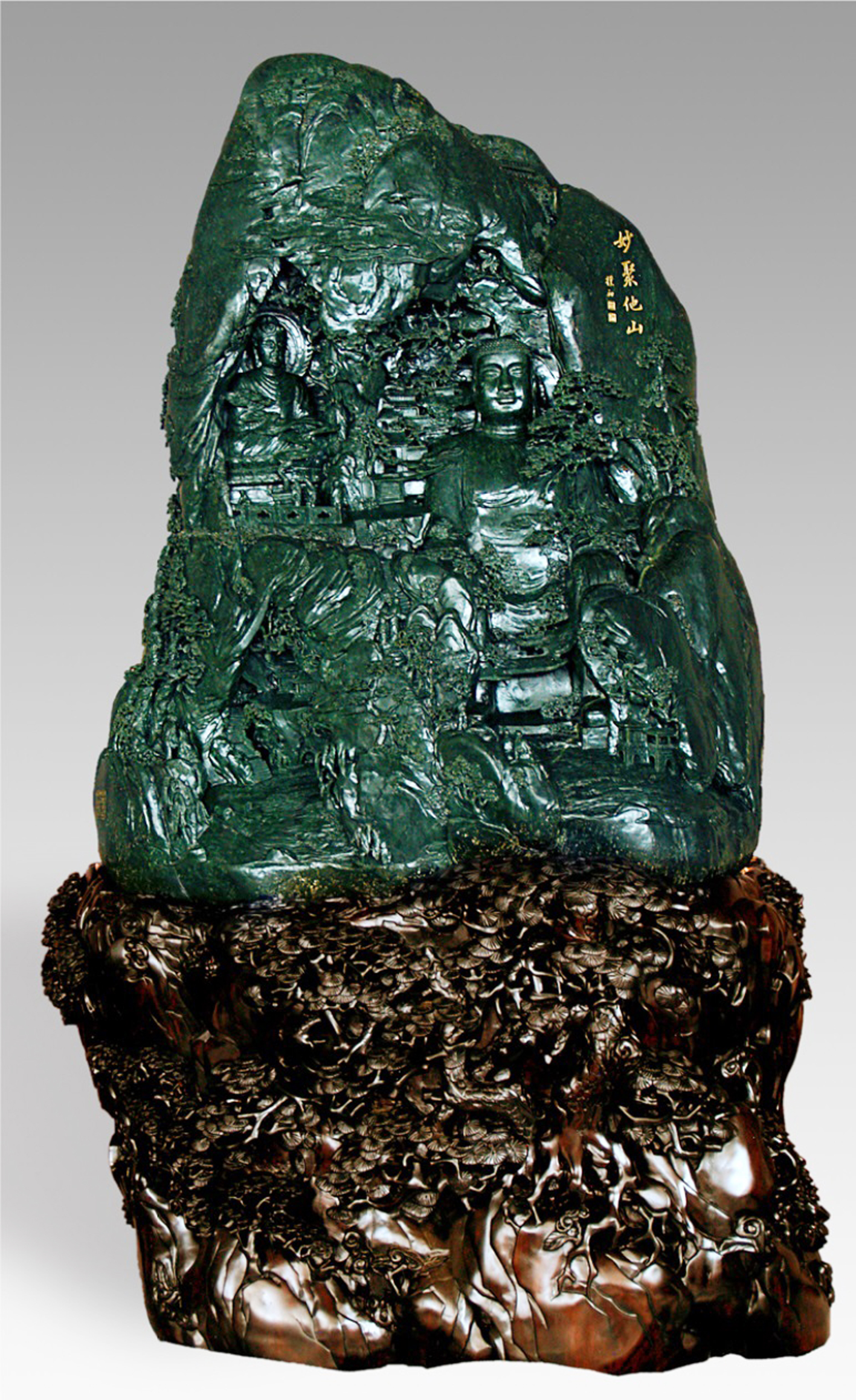 碧玉山《石刻聚珍图》玉料源于新疆玛纳斯地区,重2000余斤,色泽碧绿深沉,玉质细润。作者利用其天然优美的玉石造型,吸收了四川大佛、龙门石窟和云冈石窟等石刻艺术宝藏中的珍品,使之汇集一石,融入山水之中,体现了山籽自然美和人工雕琢美浑然结合的艺术特色,以多种雕刻手法琢制出大佛4尊、小佛14尊、游客26人,加之山峰飞云、寺院楼台、花草树木,形成了一幅立体的画面,赵朴初先生欣然题词“妙聚他山”。作品以其选材之绝、构思之巧、造型之妙、工艺之精、手法之奇的艺术特点,使扬州山子雕工艺达到了一个新的高度。1986年被国家作为珍品永久收藏。