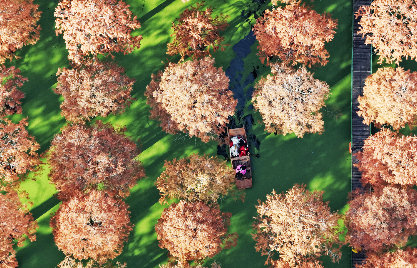 12月10日,初冬时节,扬州市渌洋湖湿地公园内的“水上森林”层林尽染,色彩斑斓的水杉林与湖水交相辉映,在碧水的映衬下,构成一幅幅美丽的冬日画卷,吸引众多游客前来观光。 孟德龙 摄