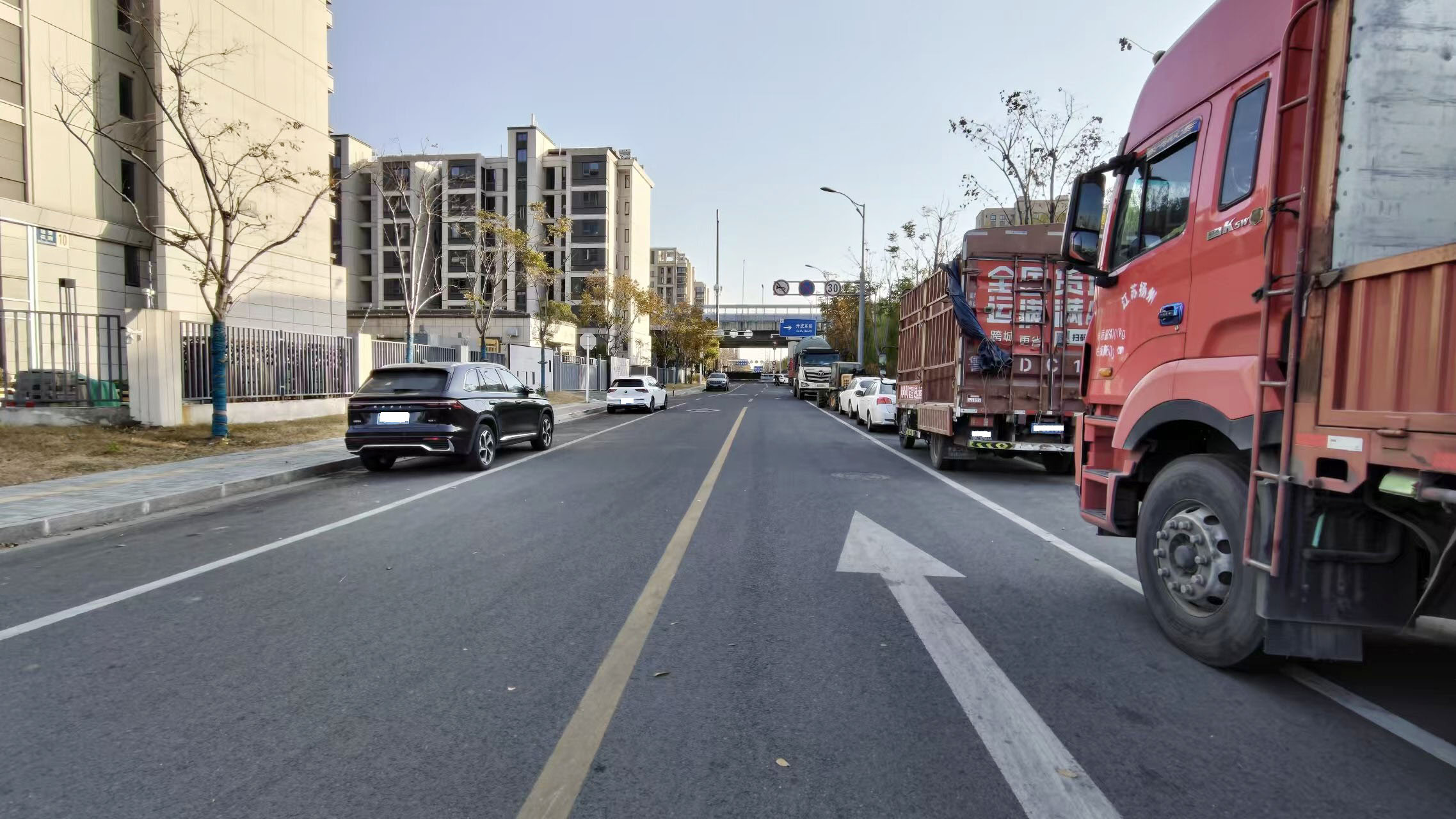 记者随后来到附近的小运河路北段,看到该段路南侧与开发东路相交叉,北段整体路面并不太长,但多处地方被车辆占用,大型施工车辆一辆挨着一辆停在路边,一些细心的市民骑车经过时都离大车远一点,防止发生碰撞。该段小运河路周边同样没有画停车位,并设有禁停标志。