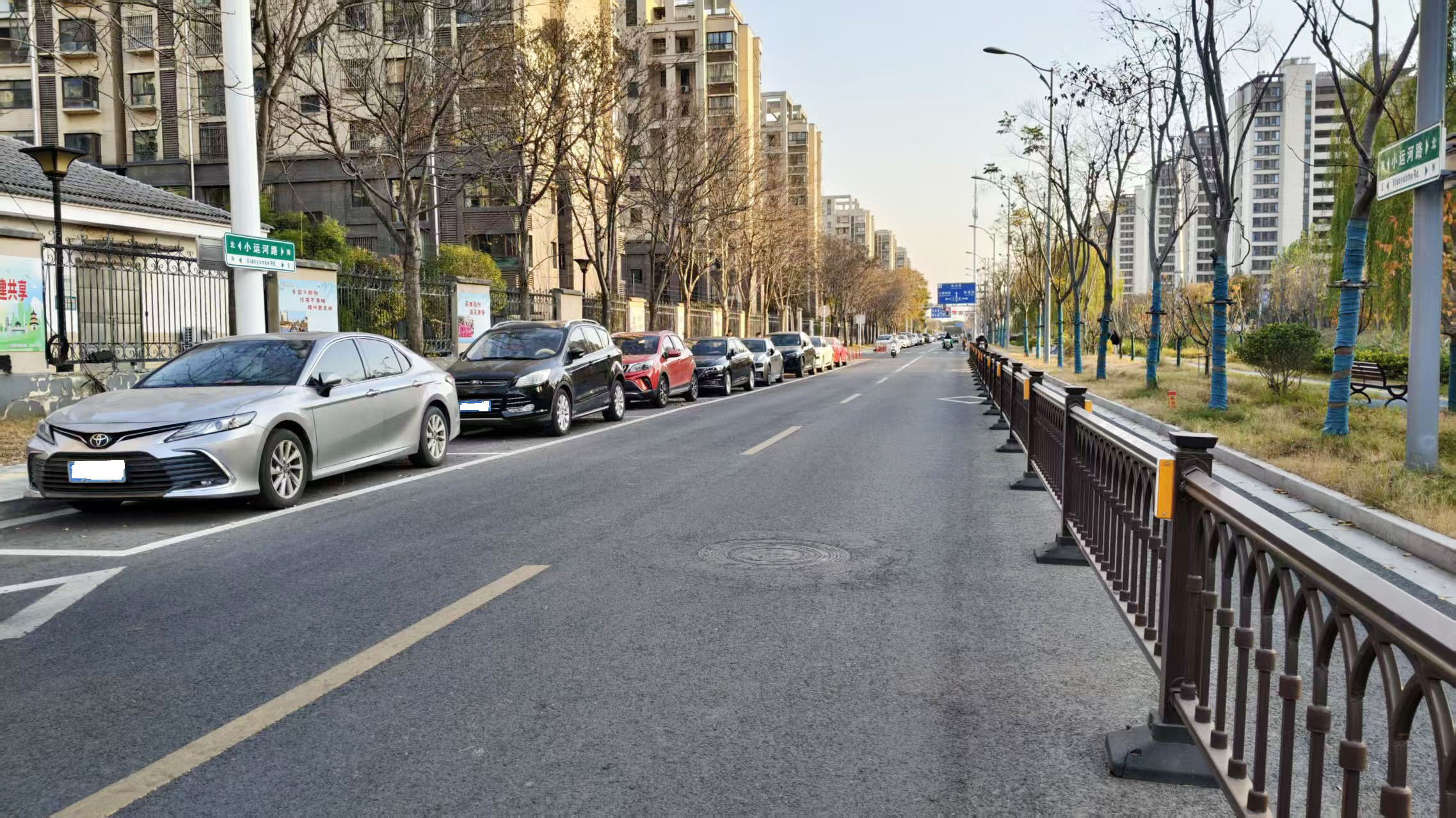 小运河路南段,一侧画停车位,并有护栏等设施