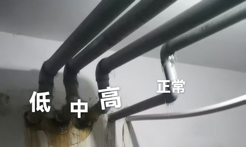 在了解情况后,陈先生来到了王先生的小区,带他来到泵房。“我们从这里可以看到有4根钢管,分为4个压力区。其中1—4层是正常压力区,5—11层为低压区,12—17层为中压区,18—26层是高压区。”陈师傅介绍,从这里可知,15楼的供水和19楼的供水不在同一根水管里,彼此之间没有关系。