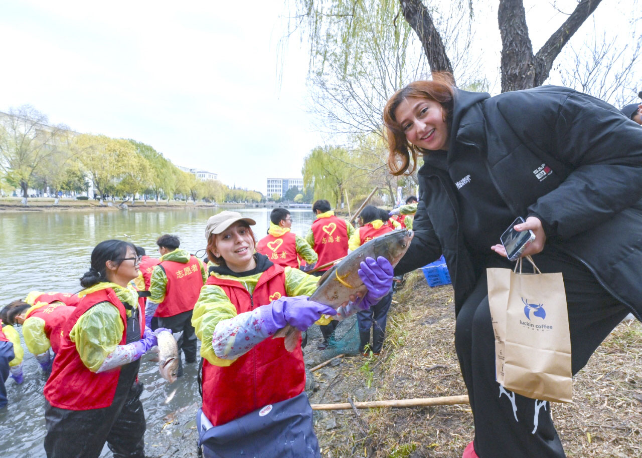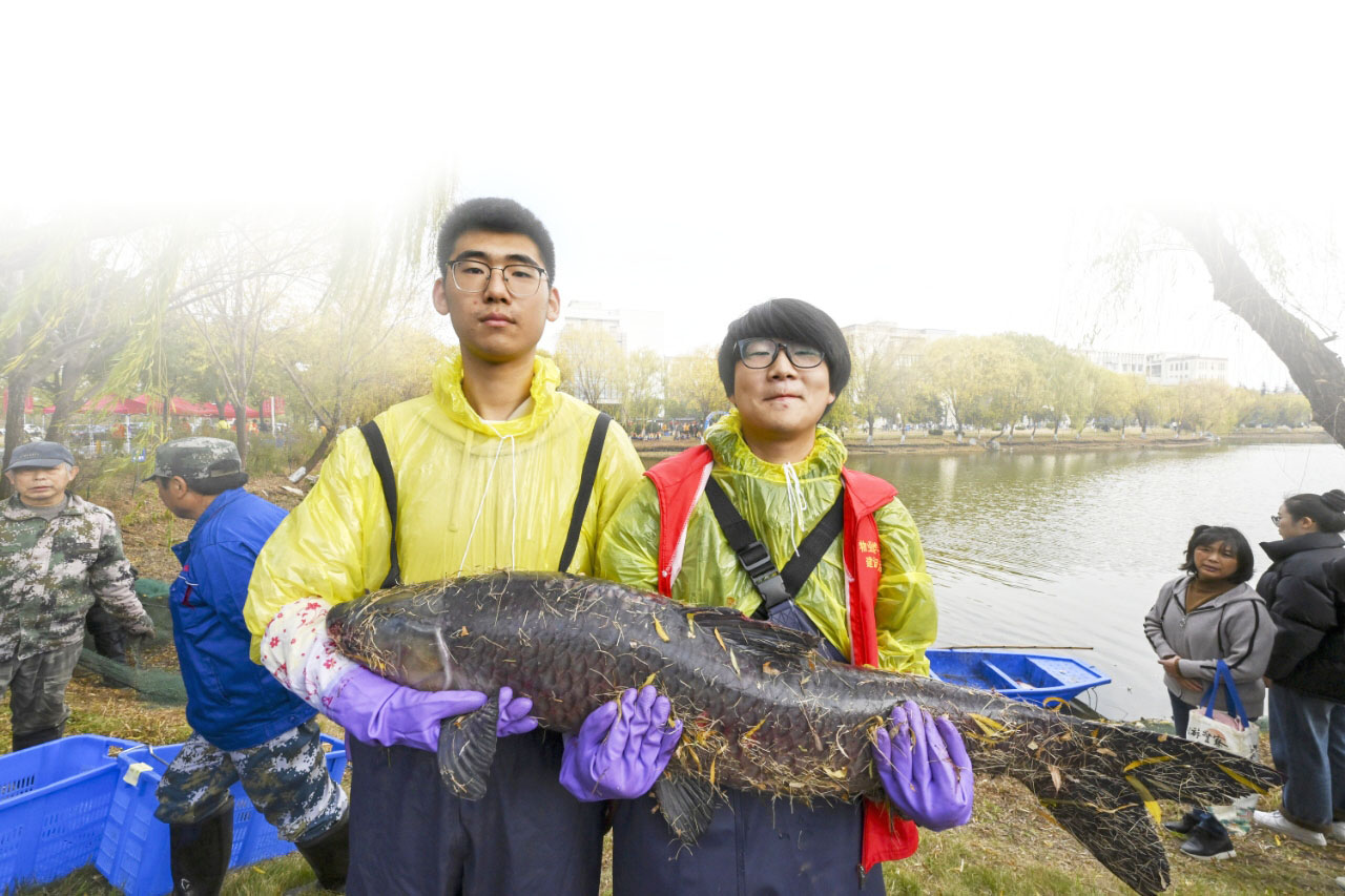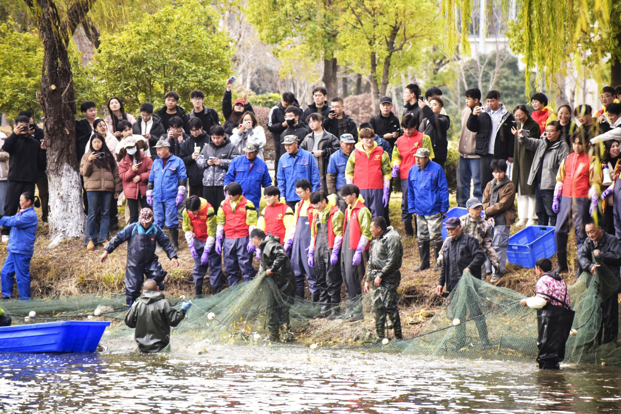 12月10日下午,扬州大学扬子津校区的朗月湖畔鱼跃人欢。扬州大学第六届捕鱼节如约而至,学生志愿者们热火朝天地捕鱼,外国留学生也沉浸式加入其中。